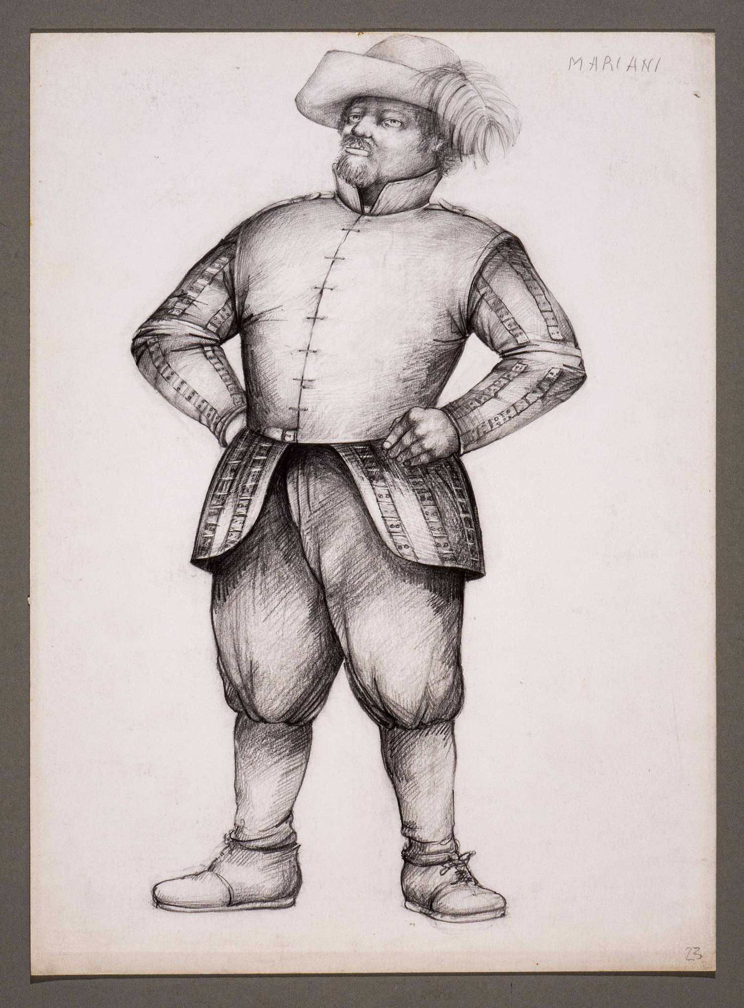 Il gioco dei potenti, libero adattamento di Giorgio Strehler da Enrico VI, dramma storico di William Shakespeare, in 15 atti e 2 giornate. Figura maschile in piedi, leggermente di tre quarti verso sinistra. Indossa un cappello piumato, una casacca con falde sotto la vita, calzoni ampi al ginocchio e calze grosse.