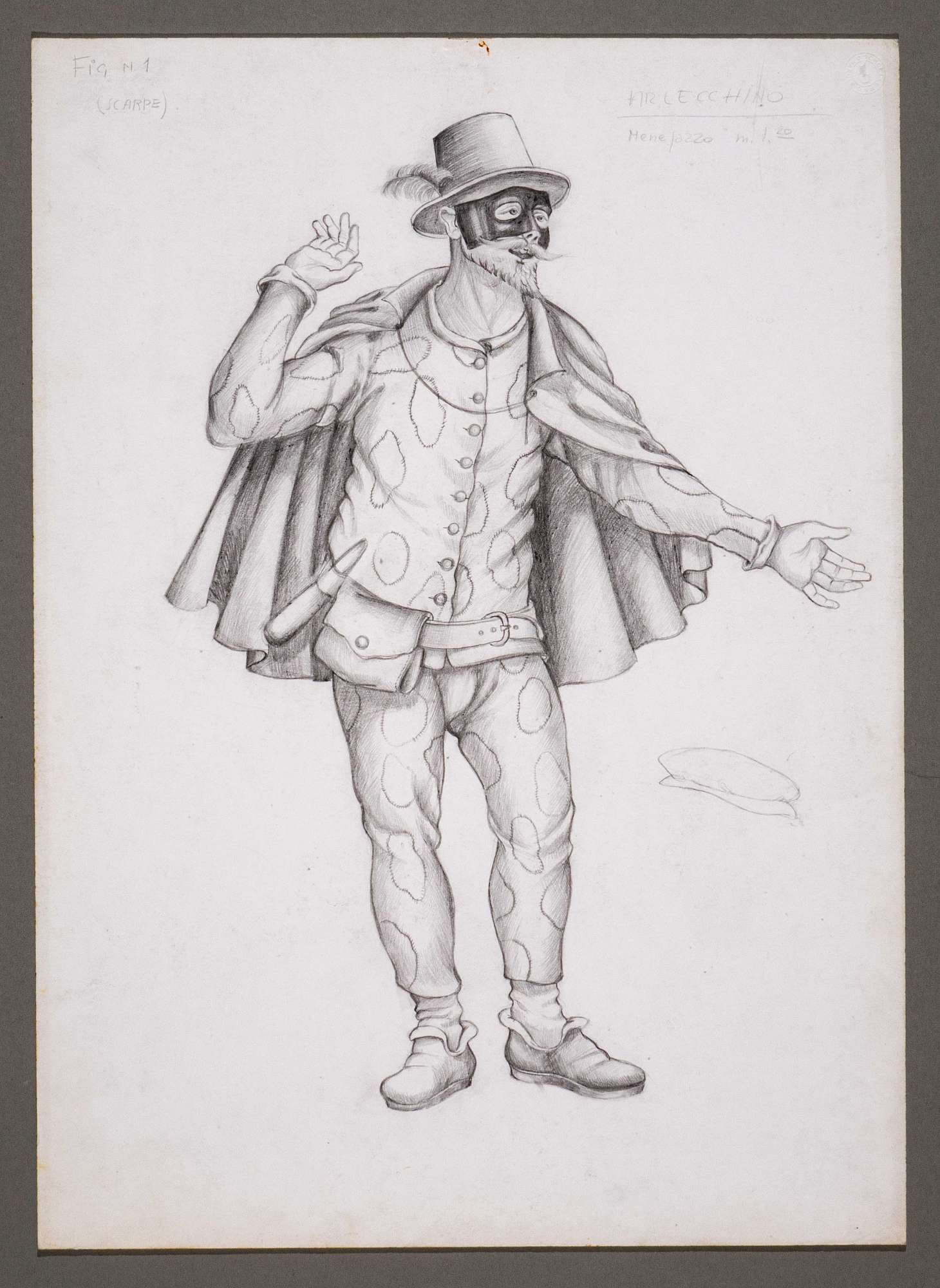 Il gioco dei potenti, libero adattamento di Giorgio Strehler da Enrico VI, dramma storico di William Shakespeare, in 15 atti e 2 giornate. Figura maschile in piedi, leggermente di tre quarti verso destra in costume di Arlecchino. Indossa un cappello a cilindro piumato, un abito a pezze tondeggianti irregolari formato da casacca e calzoni, un mantello corto. La parte alta del viso sopra i baffi e la barba a punta è coperta da una maschera. In vita porta una cintura alla quale sono infilati un manganello e una piccola borsa. Schizzo di un secondo cappello a destra della figura, al centro.
