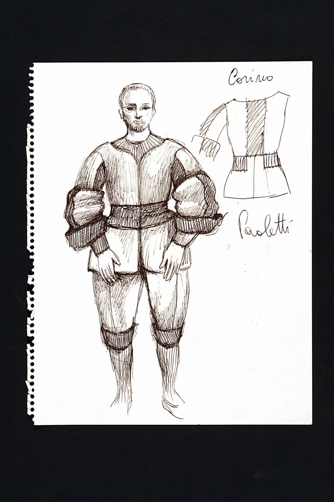 Come vi piace, commedia pastorale di William Shakespeare. Personaggio: Corino, pastore. Figura maschile intera, di fronte, in abito cinquecentesco, brache e giubba. Sulla destra schizzo della giubba vista dal retro.