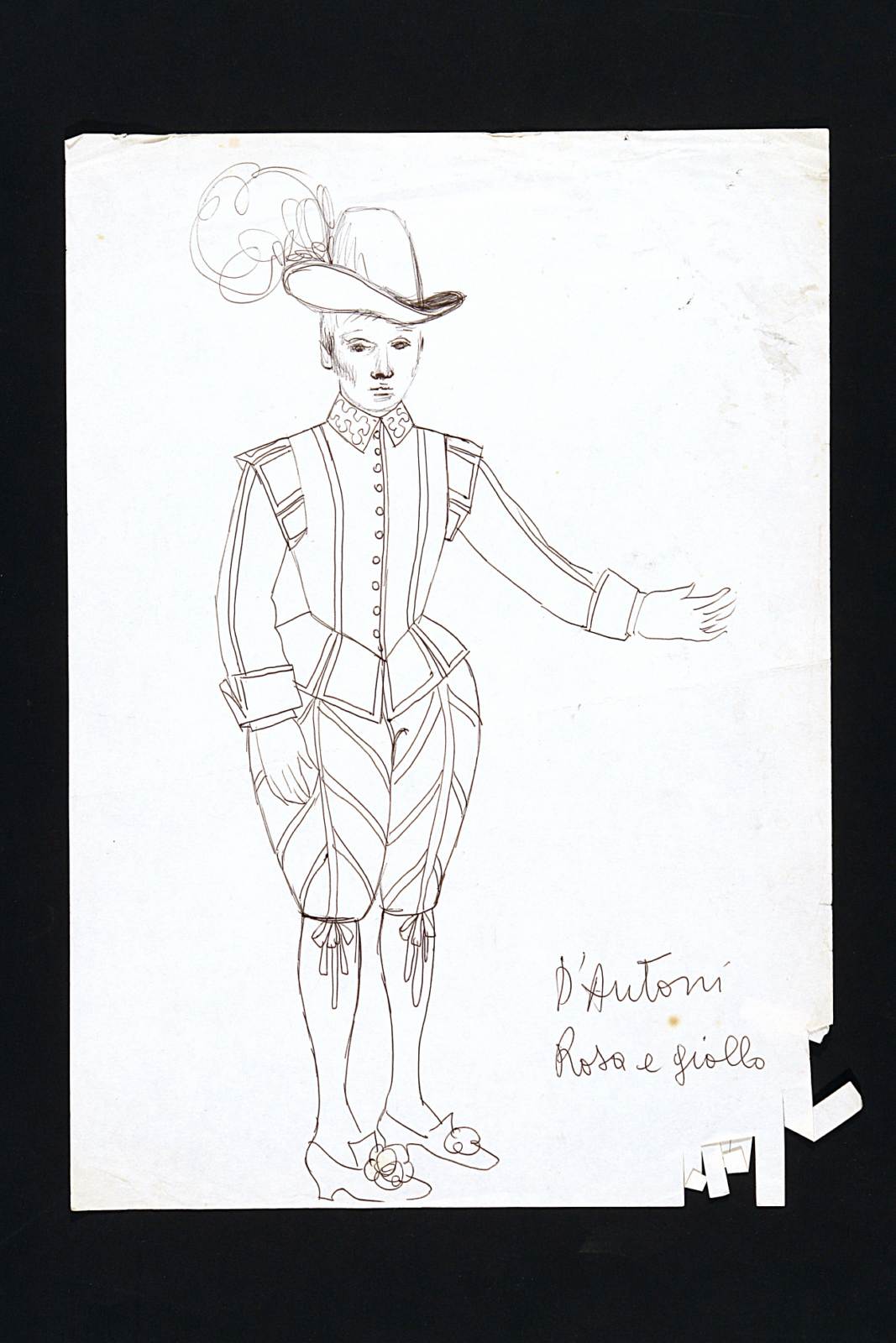 Come vi piace, commedia pastorale. Figura maschile intera, leggermente di tre quarti verso sinistra, in abito cinquecentesco, brache al ginocchio chiuse da fiocchi, giubba, cappello con piuma ariosa, scarpe a punta con fiori.