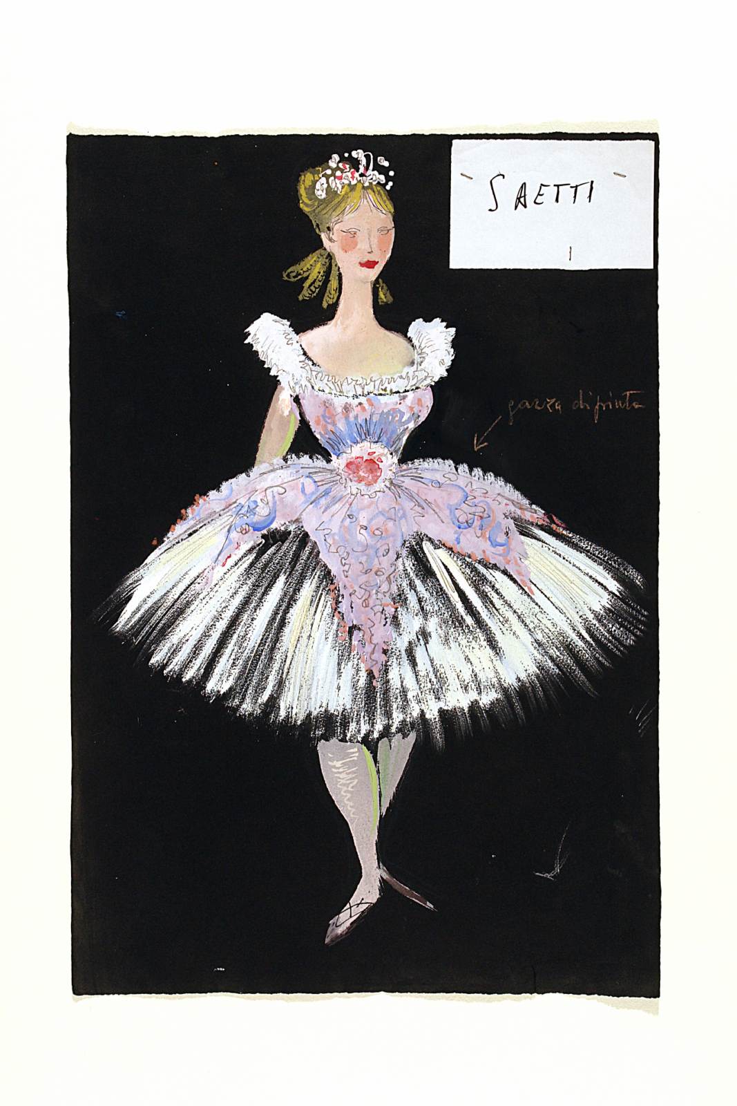 Figura femminile intera in costume da ballerina. Bustino rosa e lilla con fiore (coccarda?). in vita e scollatura bordata di ruches. Gonna in tulle, coperta, nella parte alta, da uno strato della stessa stoffa del bustino tagliata a forma di stella. Acconciatura con fiori.