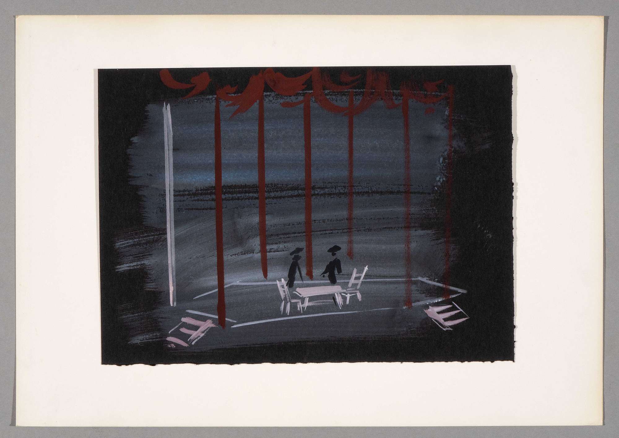 La morte di Danton, dramma di George Büchner. Struttura costruita di una serie di pali alti e di una pedana praticabile, raggiungibile con pochi scalini tanto da destra quanto da sinistra. Sulla pedana due figure umane in piedi vicino a un tavolo e due sedie