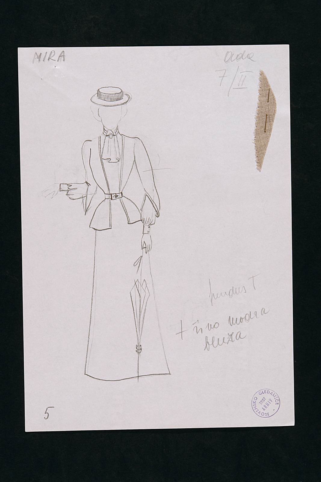 La coscienza di Zeno (Zenova Izpoved), di Italo Svevo nel rifacimento scenico di Tullio Kezich. Costume per Ada. Figura femminile intera, abito lungo, giacchina stretta in vita da cintura, cappellino tipo paglietta, ombrellino parasole