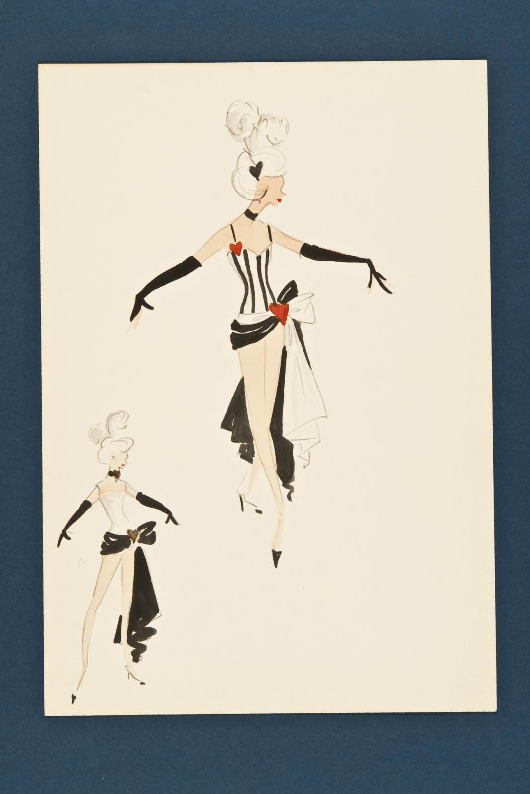 La casta Susanna, operetta in due parti di Jean Gilbert, figura femminile per ballerina del Moulin Rouge, Al centro figura in costume sbracciato a strisce con ai lati ampio fiocco con lunghi lembi pendenti e drappeggiati. Sul capo copricapo di piume, cuori applicati, scarpe a punta e tacco alto, guanti neri lunghi. A sinistra figura simile ma con costume semplice bianco e nero, senza applicazioni