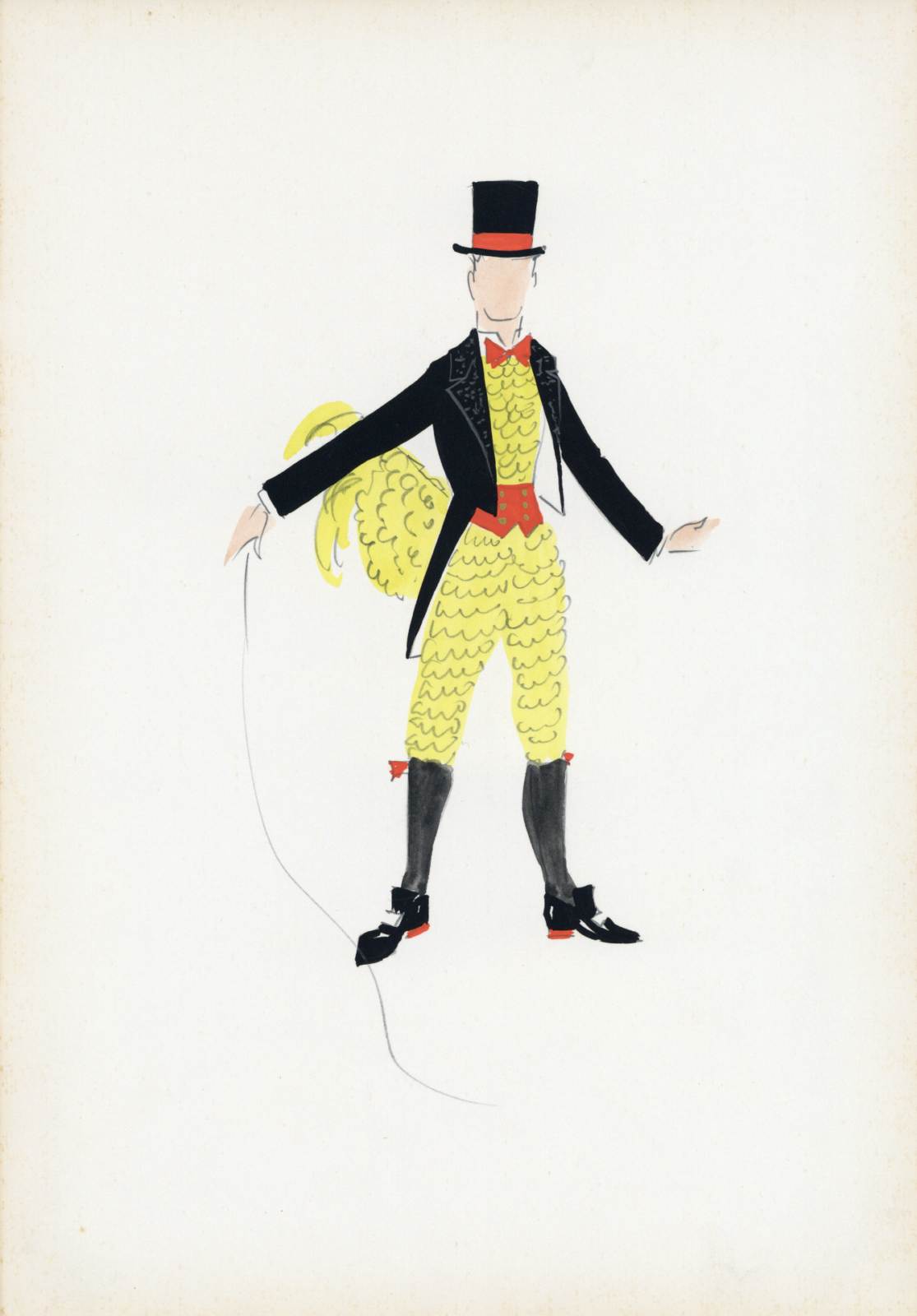 La donna perduta, operetta di Giuseppe Pietri, costume per ballerino-gallo, ambientazione caffè concerto. Indossa una tuta gialla in gale di pizzo sovrapposte, giacca nera, calzettoni neri con fiocchi rossi, scarpe con fibbia, vistosa coda di gallo, papillon rosso, frusta, marsina, cappello a cilindro con nastro rosso