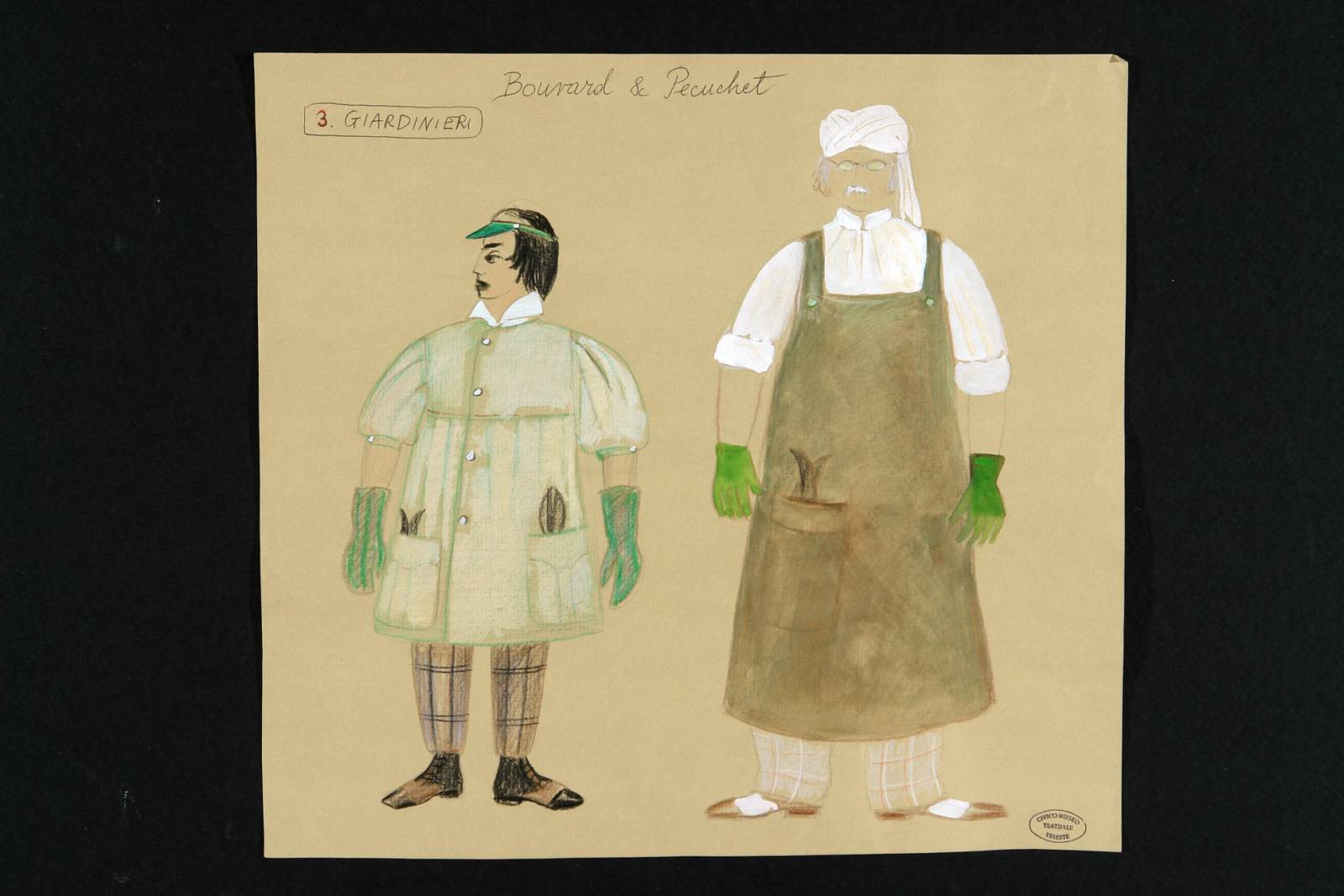 Bouvard e Pecuchet di Tullio Kezich e Luigi Squarzina da Gustave Flaubert. Personaggi: Bouvard e Pecuchet. Due figure maschili intere. La figura di sinistra indossa un frontino parasole, grembiule da giardinaggio con ampie maniche riprese al gomito, abbottonatura centro-laterale, ampie tasche portaoggetti con cesoia e forbici, sotto camicia bianca, pantaloni a scacchi, guanti verdi protettivi, scarpe marroni e nere. La figura di destra indossa turbante bianco come copricapo, camicia a maniche rimboccate, grembiule da giardinaggio, pantaloni a riquadri, scarpe bianche e beige, guanti verdi protettivi
