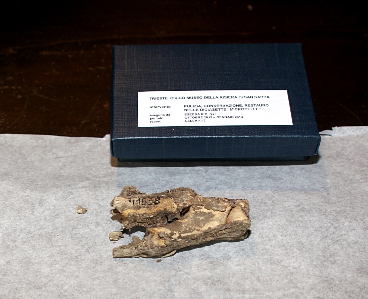 Fa parte di un nucleo di oggetti rinvenuti nelle cellette della Risiera di San Sabba nel dicembre 2013 nel corso di un intervento di pulizia, manutenzione e restauro. In particolare questo reperto è stato ritrovato nella cella n.17.