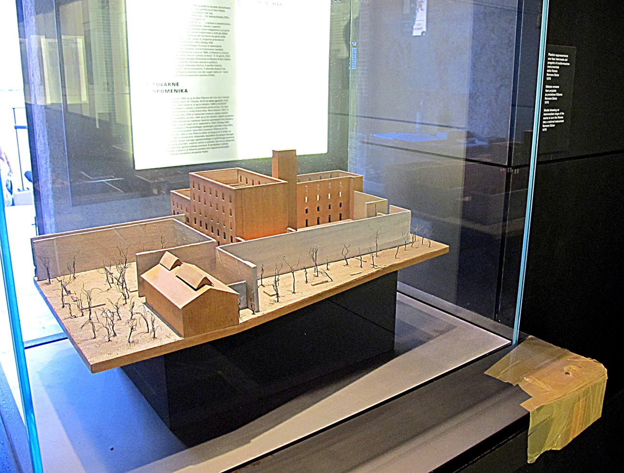 Plastico rappresentante una delle versioni del progetto di trasformazione monumentale della Risiera di San Sabba dell'architetto Romano Boico. Si individua il corridoio di entrata, la perimetrazione con le mura, il cortile e la cappella votiva. Il plastico ha i tetti scoperchiati per porre in evidenza lo svuotamento dei volumi degli edifici.