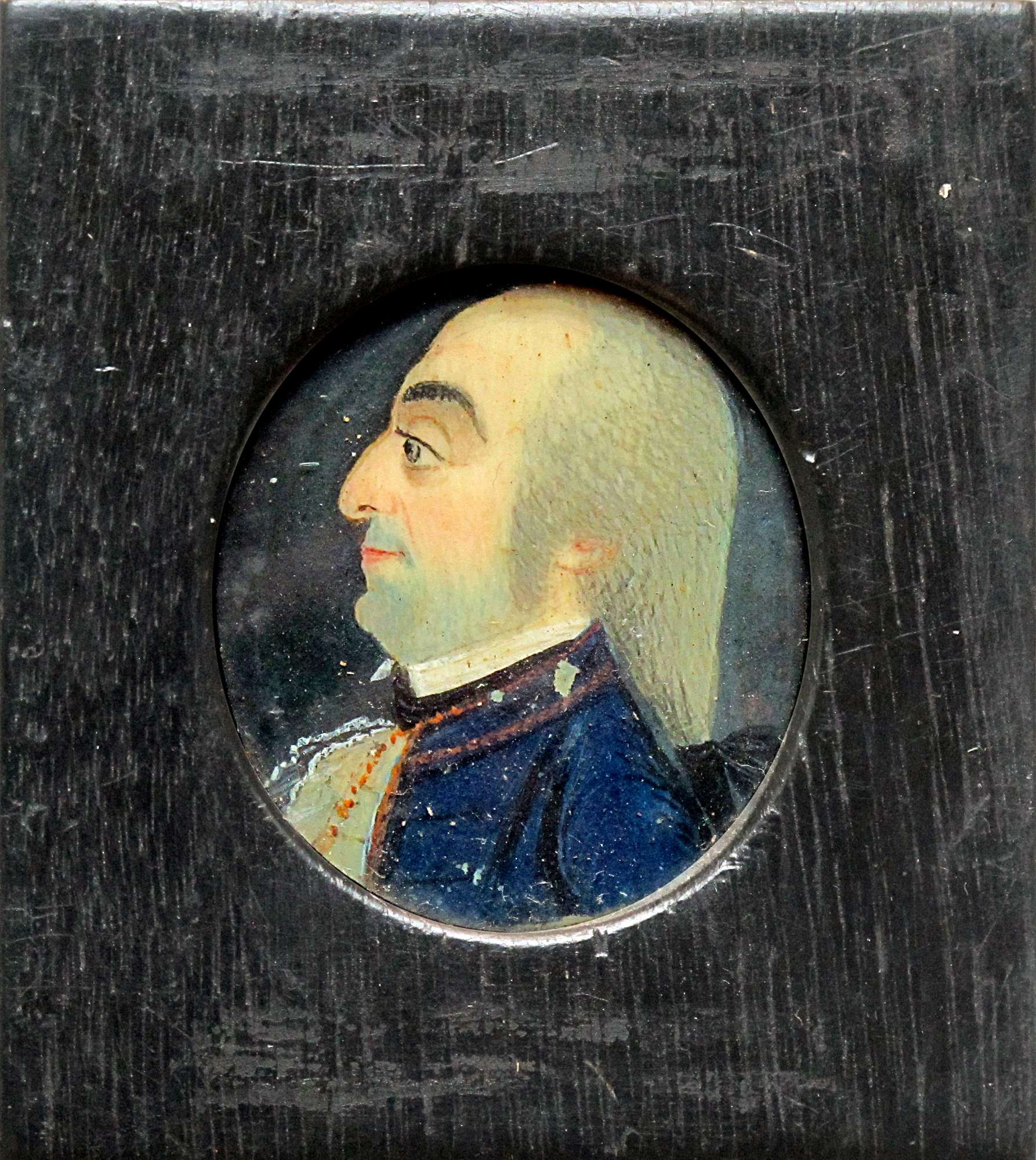 Nella miniatura, su sfondo scuro, è campito il ritratto al busto di profilo di un uomo, vestito di marsina scura che si contrappone alla camicia chiara. Il capo è coperto da una parrucca con capelli posteriormente stretti da un nastro nero. Un’iscrizione vergata a tergo della cornice riporta “Antonio de Ferretti morto li 24 ottobre 1801”. Non è stato possibile precisare il profilo biografico dell’effigiato, forse appartenente a una famiglia Ferretti di origine ferrarese, né precisare l’ambito di esecuzione della miniatura, che, racchiusa in una cornicetta lignea, mostra alcuni guasti alla pellicola pittorica.