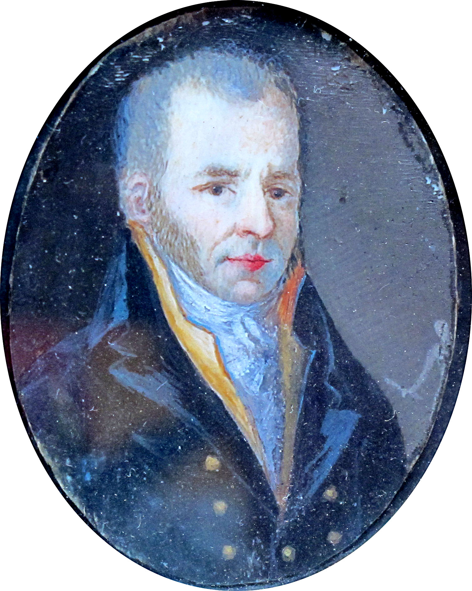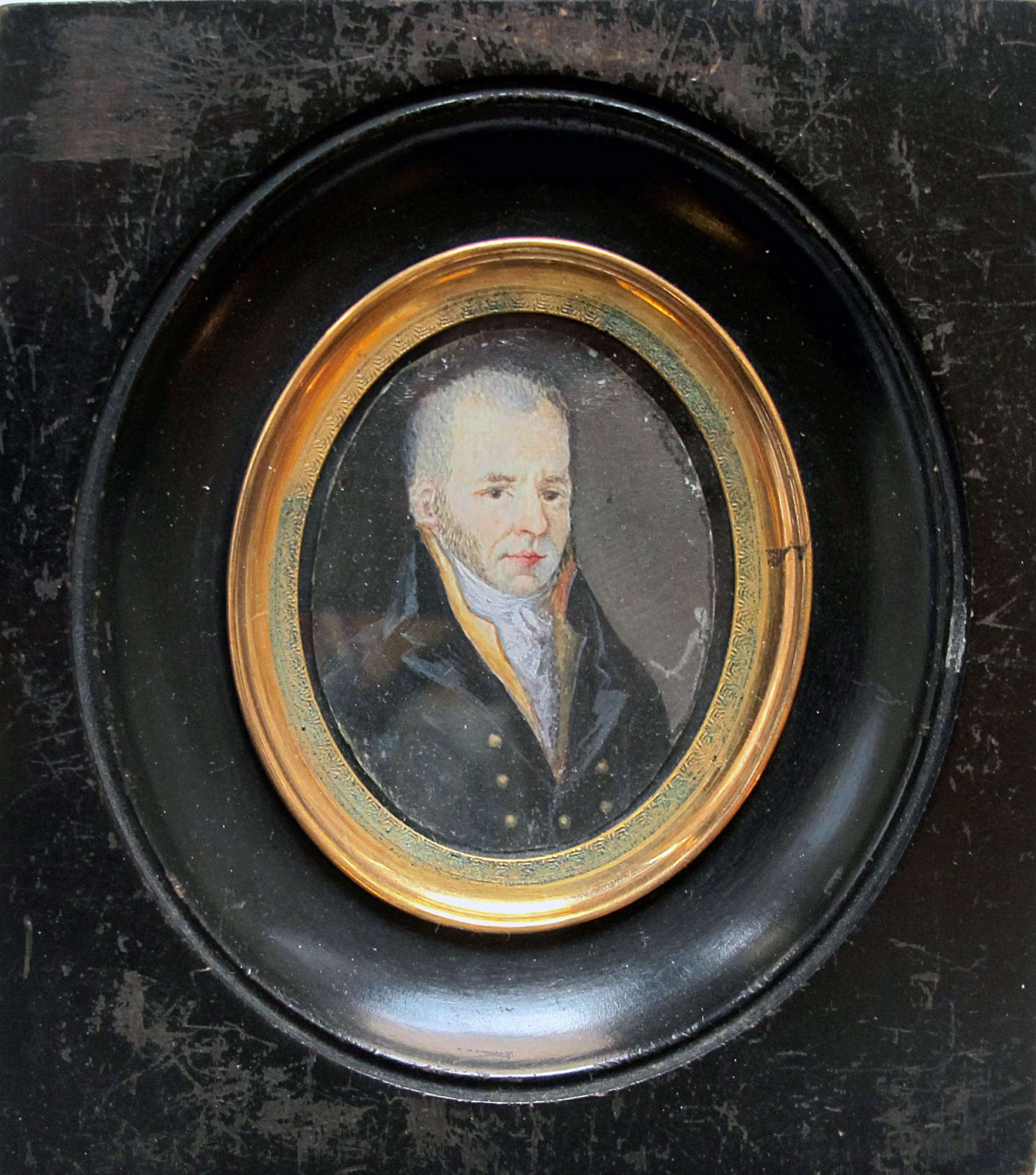 Ritratto in miniatura di formato ovale inserito in una cornice in legno, con sagomatura in metallo al centro; uomo a mezzo busto, lievemente volto verso destra, vestito di marsina scura, panciotto ocra su camicia bianca.