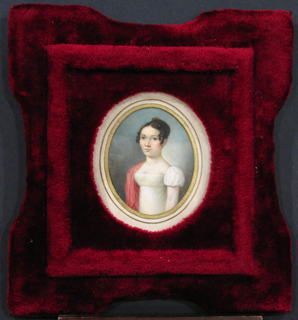 Ritratto in miniatura di formato ovale inserito in una cornice sagomata e foderata di velluto rosso. La donna è ritratta a mezzo busto, con il busto volto verso sinistra; indossa un abito stile impero, ossia una tunica alla vestale dalla linea minimalista, con corte maniche increspate a palloncino, scollatura ampia e quadrata e cucitura altissima sotto il seno; una sciarpa rossa sulla spalla destra.
