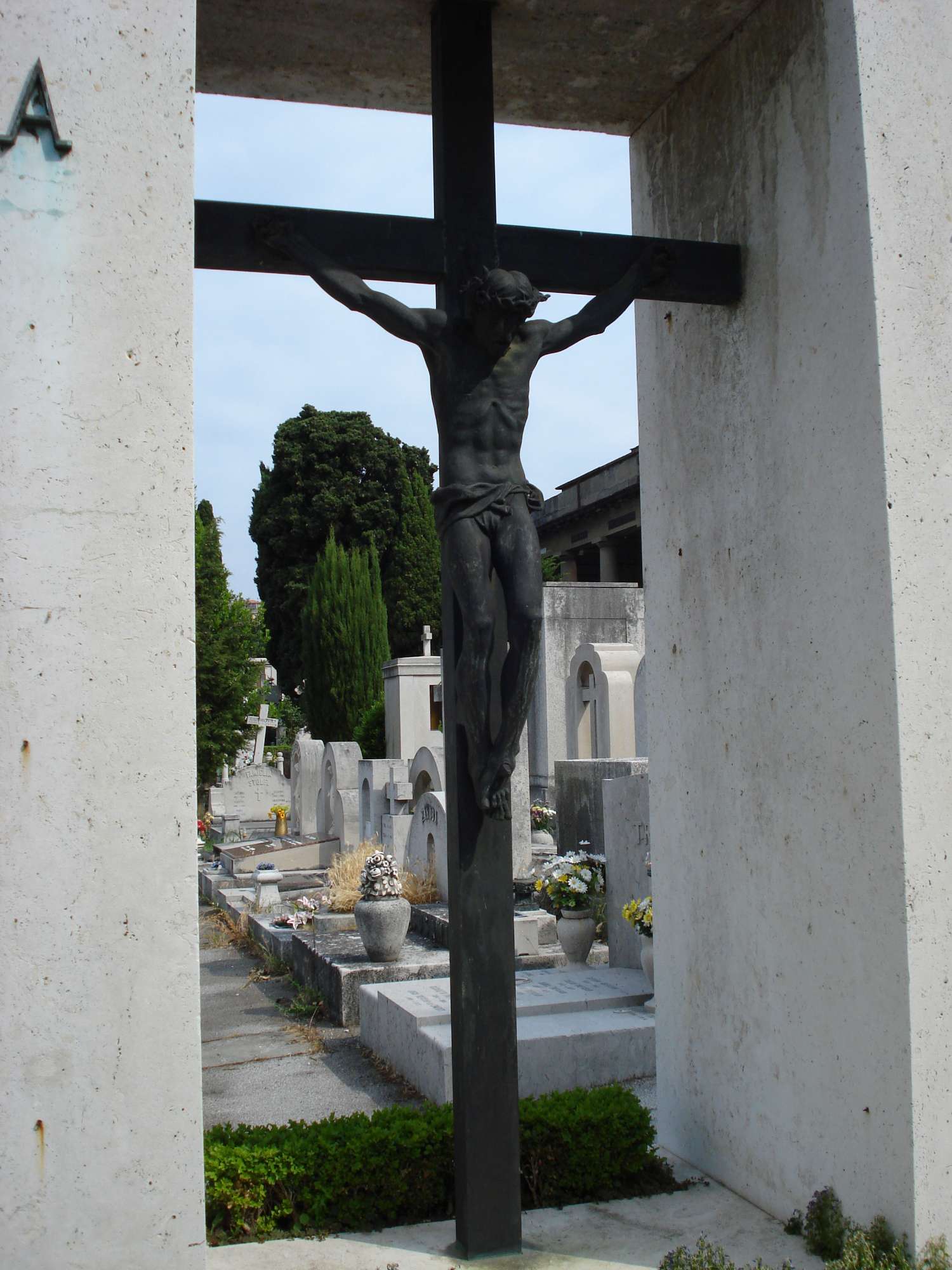 Una steruttura architettonica frontonata, decorata alla sommità con monogramma cristologico Chi Rho e ai lati da simboliche lettere greche (alfa e lambda), accoglie al suo interno un crocifisso bronzeo. Il monumento è collocato su uno zoccolo in pietra al centro del quale poggia una lastra dello stesso materiale circondata da vegetazione. Lo zoccolo è interrotto, davanti al centro, dalla presenza di un blocco in pietra sul quale poggia un vaso ornamentale.