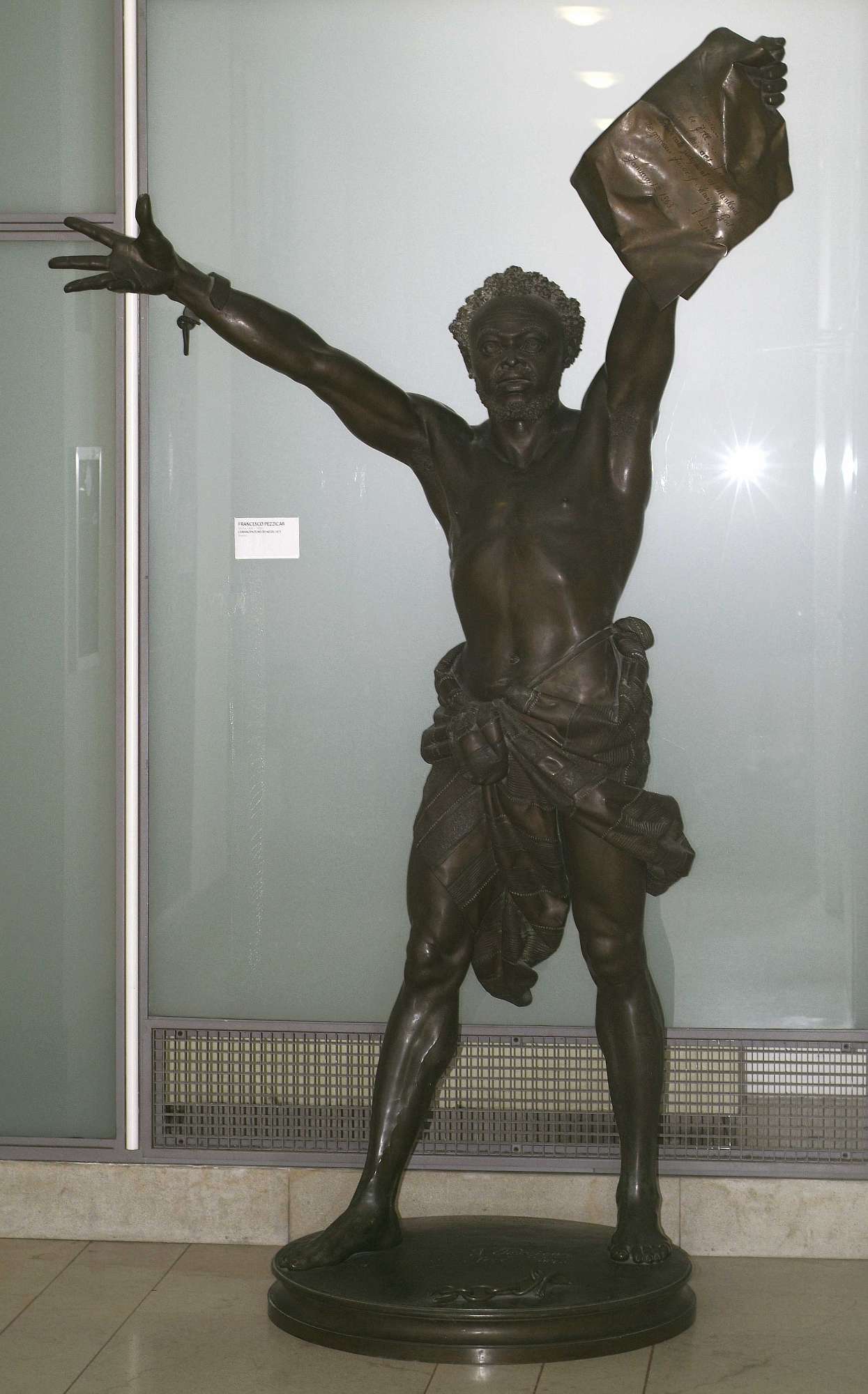 «L’abolizione della schiavitù! Concetto sublime da infiammare del sacro fuoco dell’arte la fervida mente d’un artefice in cui riflettonsi gli umanitari sensi di un’anima nobile e grande! La mente del Pezzikar concepì arditamente così sublime pensiero. Come egli ebbe lo abbia tradotto in atto con sapienza artistica, con studio, con filosofia, lo vedremo tosto. È la figura d’un negro americano dai muscoli pronunciati pel soverchio lavoro, che afferrato con mano febbrile il decreto abolizionista, si slancia anelo per dire agli uomini: son vostro pari! Questa statua, mirabilmente modellata e sestinata alla fusione in bronzo, fu già ammirata, nello studio di Pezzikar in via Amalia, dai molti intelligenti della città nostra. Contemplandola ieri con religione, non abbiamo potuto a meno di recriminare contro il tempo, all’abile artefice mancato, per condurla a termine prima d’ora. Sarebbe stato un peregrino lavoro di più fra i più belli dell’Esposizione di Vienna. Pazienza! L’opera del Pezzikar segna un grande progresso in statuaria: l’autore si staccò completamente dal classicismo, uniformandosi alla moderna aspirazione che vuole il vero in tutto e per tutto» («Il Cittadino», 1873). Queste le parole della cronaca del tempo per descrivere questa imponente figura con le braccia levate, le catene spezzate e il decreto abolizionista in mano (Libertà va cercando ch’è si cara). L’espressione è viva, con la bocca semiaperta che sembra stia per emettere un grido di gioia. «Il nudo è trattato che con sapienza anatomica, e la ciarpa che avvolge i fianchi – unico ornamento di quello schiavo, dal tipo rigorosamente fedele al vero – è con molto garbo e con non minor sobrietà composta» («Il Cittadino», 1873). Così veniva descritta la scultura nel 1873, anno della sua realizzazione, dalla cronaca del tempo. Un’opera che racconta i fatti di dieci anni precedenti e che viene riportata da Pezzicar con grande abilità. La grande statua in bronzo si situa fra i maggiori lavori realizzati dall’artista, e pur riscuotendo sin da principio grande ammirazione da parte della critica, rimane invenduta per molti anni, forse a causa dell’ostinazione dell’artista nel non voler ridurre il prezzo stabilito. Nel 1876 l’opera partecipa all’Esposizione Universale di Filadelfia e viene premiata con la grande medaglia d’oro.