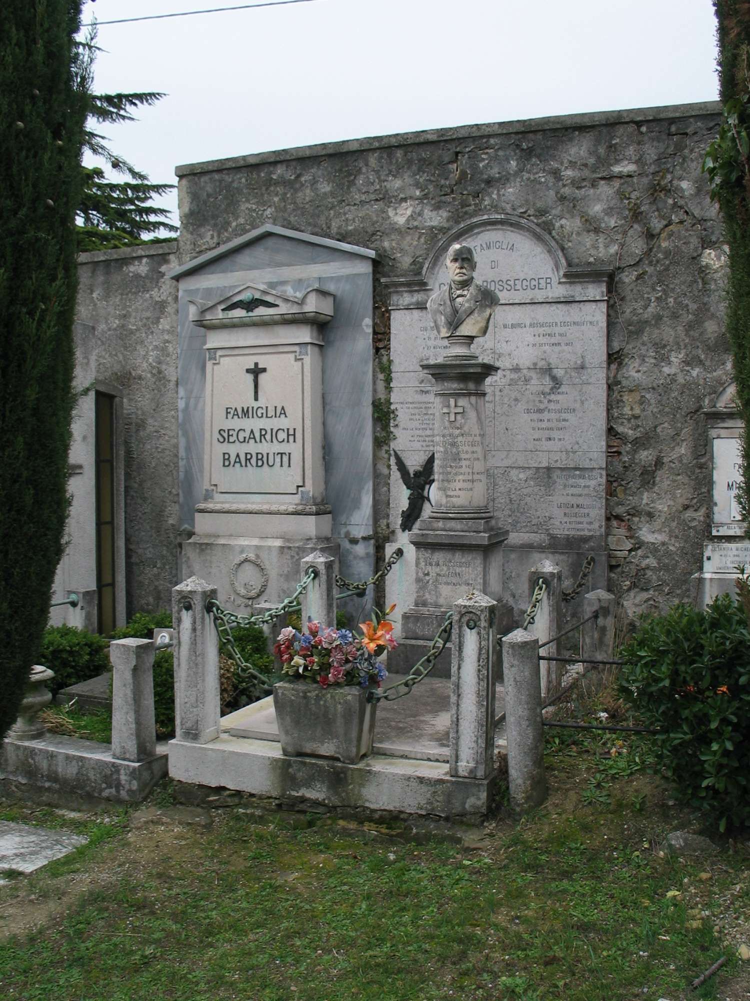 Una lapide di marmo, recante iscrizioni e coronata da lunetta, è decorata nel lato sinistro da un angelo bronzeo a rilievo, che regge un tondo con ritratto fotografico; davanti alla parete, su una colonna con piedestallo, è posizionato il mezzobusto di Giulio Rossegger. L'intero monumento è recintato da quattro pilastrini collegati tra loro da catene.