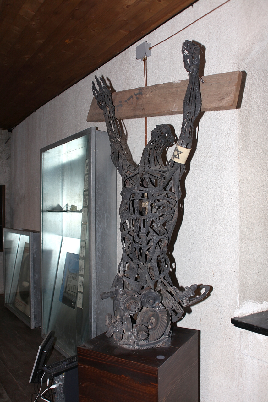 La scultura rappresenta un uomo con le braccia alzate, legate a una tavola di legno; sul braccio sinistro porta una fascia in stoffa con la stella di David. La figura è realizzata con fili di ferro spessi intrecciati e bulloni nella parte bassa.