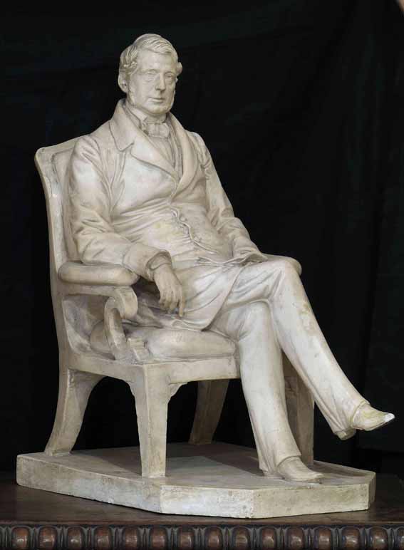 Dei diversi ritratti del fondatore conservati nelle raccolte del Museo Revoltella questo, dello scultore tedesco Karl Cauer, propone un’interessante variante a figura intera di Pasquale Revoltella, realizzato quando aveva sessantatré anni e in un momento della sua vita di particolare successo e vitalità. Nel 1858, infatti, si concludevano i lavori di costruzione della residenza cittadina di Pasquale Revoltella, ufficialmente inaugurata la sera del 23 febbraio del 1859, ma gli ultimi anni di quel decennio importante, vedevano impegnato il fondatore del museo, oltre che nelle vicende personali – il completamento del palazzo di città e l’edificazione della Villa Revoltella sul colle del Farneto –, anche in numerose iniziative pubbliche tra cui, preminente, il colossale progetto del taglio dell’Istmo di Suez, i cui lavori sarebbero iniziati proprio nel 1859. Attribuita in passato erroneamente ad altro scultore, a causa della scarsa leggibilità della firma riportata sulla base dell’opera, la scultura ritrae Revoltella seduto in poltrona con una naturalezza del tutto inedita rispetto ai ritratti a noi noti del finanziere veneziano. Appoggiato sul bracciolo destro, con la mano mollemente abbandonata, regge con l’altra un libro sottile, mentre il suo sguardo è sereno e si spinge lontano. Indossa la finanziera, morbidamente riprodotta, le gambe accavallate. L’intera postura di Revoltella trova un corrispettivo sorprendente nel ritratto a figura intera del principe di Metternich, realizzato in gesso dallo stesso Cauer nel 1857, già proprietà della regina Giuliana dei Paesi Bassi e in seguito battuto all’asta da Sotheby’s presso il RAI Theatre di Amsterdam nel 2011. Considerato lo stretto legame di Revoltella con l’architetto Hitzig, ideatore di Palazzo Revoltella, nonché responsabile della decorazione degli interni della residenza e della scelta di oggetti d’arte e arredi, è plausibile che sia stato proprio l’architetto berlinese a suggerire al padrone di casa il nome dell’autorevole scultore tedesco per la realizzazione di un suo ulteriore ritratto, dopo le litografie del tedesco Kriehuber del 1836 e 1855 e, in anticipo di un anno, rispetto al ritratto del milanese Pietro Magni.