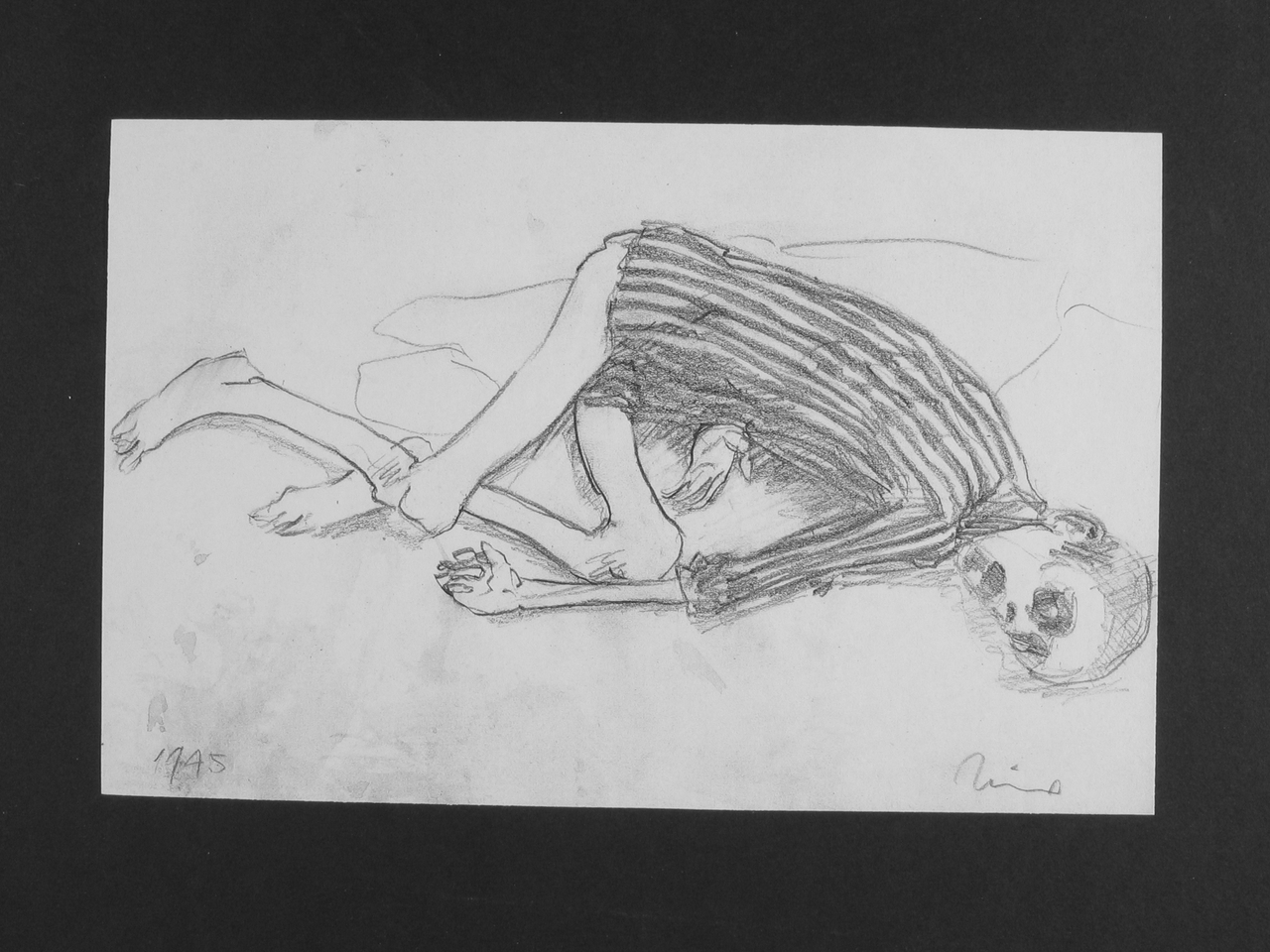 Una persona è a terra, scheletrica, con indosso solamente una giacca a righe.