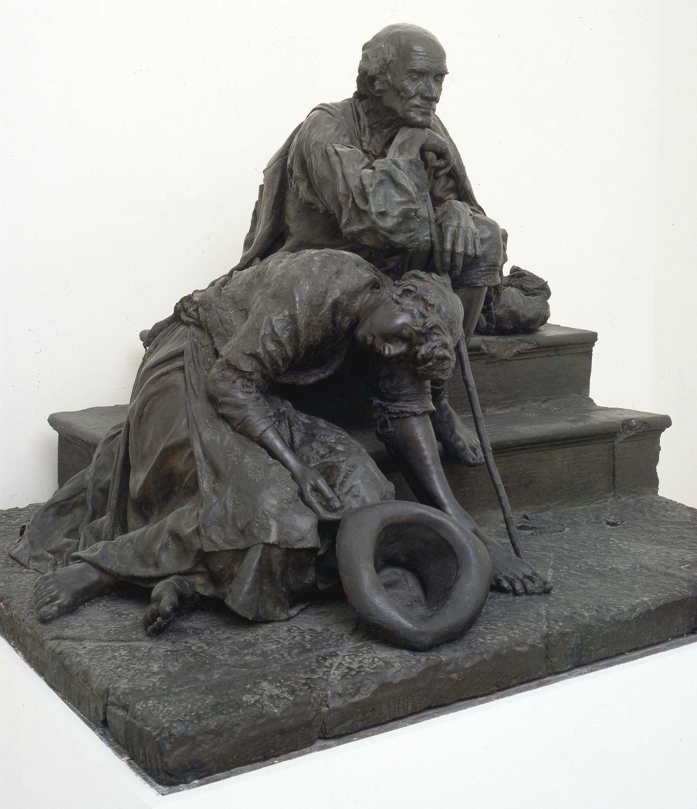 La complessa trattativa per l’acquisto del grande gruppo scultoreo in gesso dipinto è documentata nei verbali del Curatorio dell’epoca e negli scambi epistolari conservati in archivio ed attesta il valore dell’acquisizione di un’opera di elevata qualità e significato. Realizzata dallo scultore veneziano per una versione finale in bronzo, mai eseguita, la scultura fu molto apprezzata e premiata con medaglia d’oro all’Esposizione Nazionale di Venezia del 1887 e all’Esposizione Internazionale di Monaco di Baviera del 1888. "Belisario", trasposizione in età moderna di un personaggio realmente esistito e identificato nel noto generale Flavio Belisario, che nel VI d.C. operò al fianco dell’imperatore Giustiniano affrontando con successo diverse orde barbariche, veste perciò i panni di un combattente d’epoca risorgimentale, ridotto in povertà a causa dei gravi dissesti economici dell’Italia postunitaria, incapace di offrire un sostentamento ai reduci di guerra. L’attenzione estrema posta dallo scultore nel definire realisticamente i dettagli, dalle medaglie appuntate sulla giacca alle rughe del volto, alla naturalezza estrema del panneggio della giovane donna ai suoi piedi, denota una eccezionale maturità artistica del suo autore, ugualmente teso a conferire all’insieme una compostezza equilibrata e suggestiva. Fu Giuseppe Caprin, tra i componenti illustri del Curatorio di quei decenni, a convincere infine la maggioranza ad acquistare l’imponente scultura per il prezzo di 2.000 Lire, evidentemente consapevole dell’importanza dell’opera e del suo artefice. Altrettanto orgoglioso di vedere rappresentata la propria opera al Museo Revoltella fu Urbano Nono, come confermato nella lettera autografa indirizzata al mediatore dell’affare, Guglielmo Guggenheim, nel marzo 1889, in cui lui stesso dichiara: «Mi sorriderebbe l’idea di vedere un mio lavoro ornamento del benemerito Istituto, decoro e vanto della colta e gentile Trieste» (CMR, Arch. Amm., 2.1889.849).
