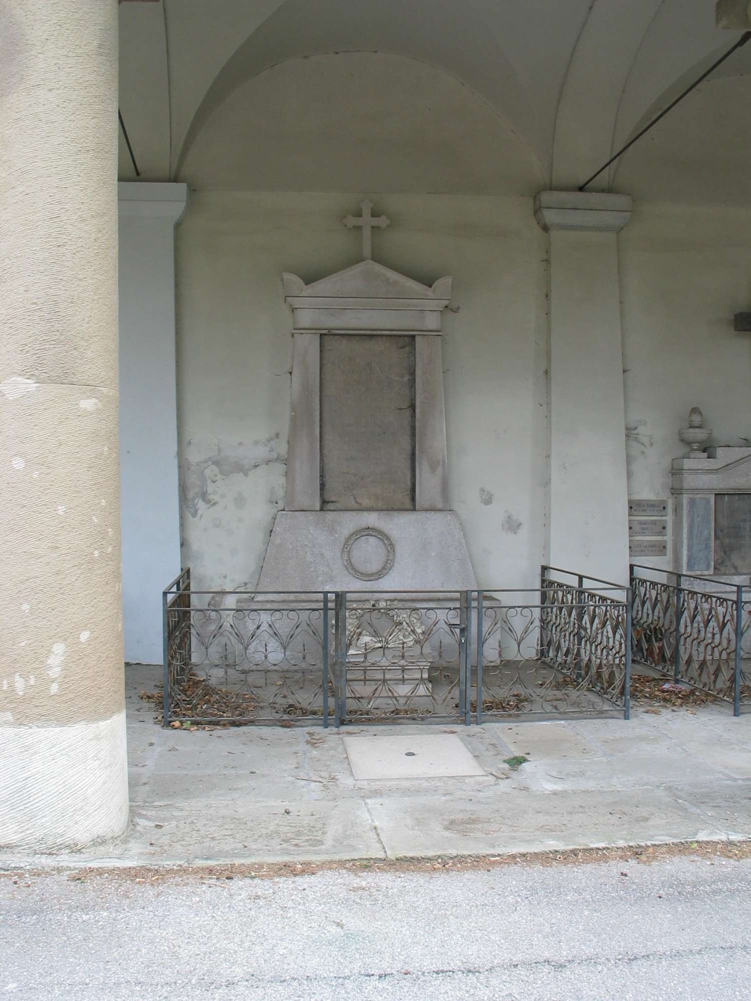 Su una semplice stele frontonata e coronata da una croce, addossata alla parete di fondo, spicca una grande lapide di marmo nero con l'iscrizione, originariamente a lettere d'oro. Al centro della sezione trapezoidale del basamento è scolpita in bassorilievo una ghirlanda di alloro; una seconda ghirlanda di fiori scolpita è posta sul basamento che precede l'edicola