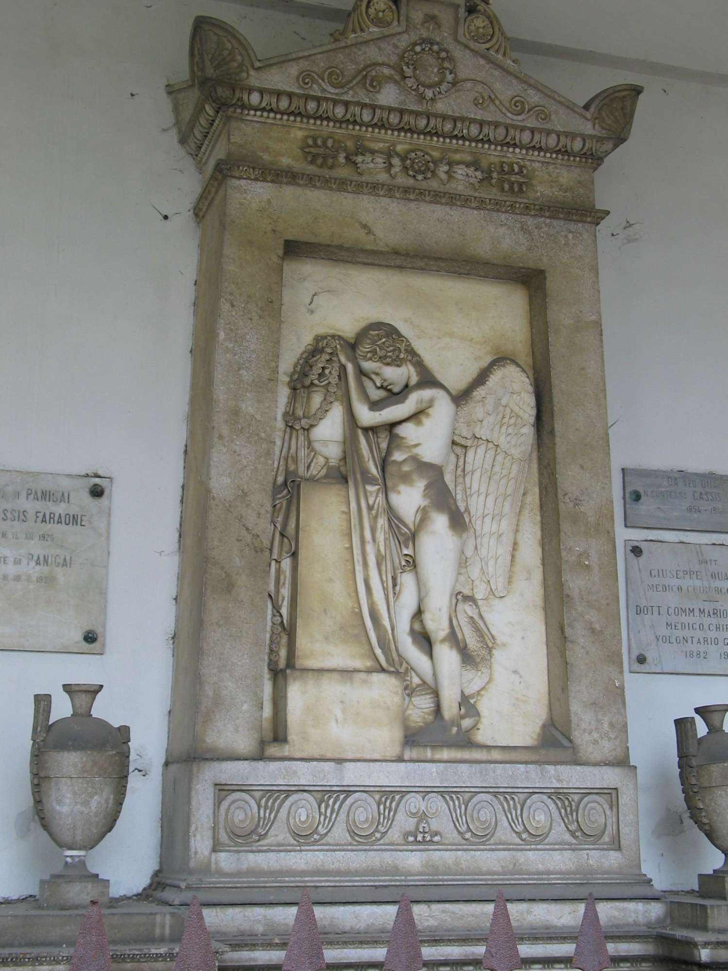 Un'edicola, frontonata e coronata dallo stemma di famiglia, accoglie un rilievo raffigurante un angelo, di profilo, appoggiato ad un'urna poggiata su piedistallo, adorna di ghirlande e coperta da un drappo; ai piedi dell'angelo si trova un pellicano. L'edicola poggia su un basamento con l'iscrizione dedicatoria ed è affiancata da entrambi i lati da un vaso di pietra.