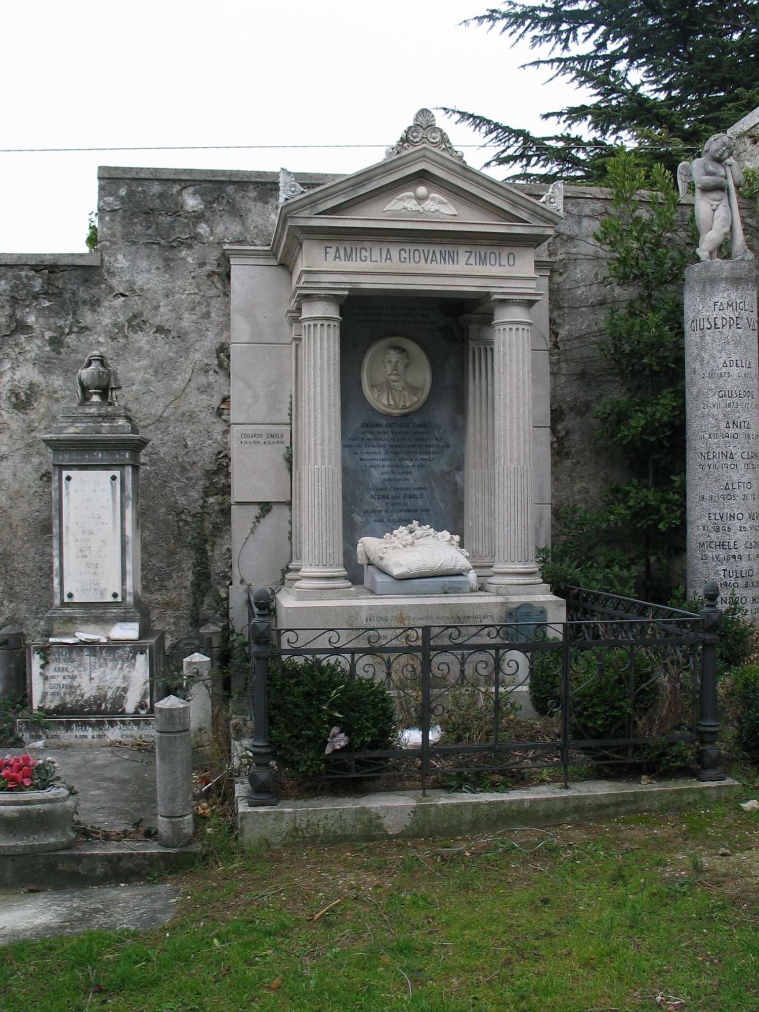 Sulla parete di fondo, rivestita da lastre di marmo, è addossata un'edicola frontonata con paraste e colonne scanalate, posta su un basamento e decorata nel timpano da un rilievo col globo alato; all'interno dell'edicola, su una lastra di marmo nero, è collocato il medaglione con il ritratto di Giovanni Battista Zimolo; sopra il basamento, in posizione centrale, è appoggiato un cuscino marmoreo decorato da un fascio di fiori a rilievo, mentre sul fronte del basamento, a destra, è una targa bronzea curvilinea con iscrizioni. L'intero monumento è circondato da una bassa cancellata in ferro battuto.