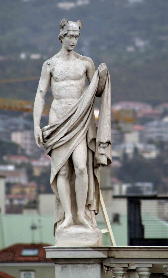 Le sei statue poste a coronamento di Palazzo Revoltella furono completate sicuramente entro il luglio del 1857, quando vengono citate per la prima volta sulla stampa locale. Nel progetto firmato da Friedrich Hitzig per Palazzo Revoltella del 1853 sono previste, sull’attico del fronte principale, sei statue dall’iconografia non chiaramente identificabile (Hitzig 1853), mentre nel medesimo progetto pubblicato in volume, nel 1864 le statue sono quattro e rappresentano le stagioni (Hitzig 1864). La realizzazione finale, affidata a Bosa, si indirizza invece ad una programmatica manifestazione della “morale borghese” di Pasquale Revoltella, in cui vengono celebrati i fattori che concorsero alla sua fortuna: Commercio, Industria, Ingegno e Navigazione sul fronte principale e Calcolo ed Economia sui prospetti laterali (rispettivamente di via Cadorna e via Diaz). L’identificazione di tali allegorie, spesso confuse tra loro nelle schede inventariali del Museo, è possibile grazie a due fogli autografi conservati al Museo Correr di Venezia (inv. cl. III n. 2892 e 2893), nei quali ciascuna allegoria è accompagnata da una didascalia che la identifica. Le sculture, improntate a un diligente classicismo, appaiono estremamente danneggiate dagli agenti atmosferici e mutile di alcuni attributi. Il Commercio ha in capo il petaso alato di Mercurio, ma risulta privo del caduceo (presente nel disegno del Correr), che pare di scorgere nella tempera di Alberto Rieger del 1865 raffigurante Palazzo Revoltella (Possamai 2022, p. 46), l’Industria tiene in mano un alveare (anziché la falce raffigurata nel citato disegno) e un martello, l’Ingegno è caratterizzato da penna (di cui ora è mutilo, ma che è visibile nelle schede inventariali degli anni Sessanta), libro e locomotiva (non prevista nel disegno del Correr), la Navigazione appare mutila degli attributi (previsti dal disegno del Correr) della bussola, visibile ancora nelle schede inventariali degli anni Sessanta, e dell’àncora, che si scorge ancora fino al 1913 circa in una foto di Francesco Penco. Sui prospetti laterali sono posti il Calcolo, che srotola un cartiglio, e l’Economia, che regge una borsa piena di denari. Si segnala che nella Rassegna di pittura e scultura dell'Ottocento a Trieste del 1937 è stata esposta una Navigazione di Francesco Bosa di proprietà del Museo Revoltella, di cui si sono perse le tracce. (Rassegna 1937, p.9)