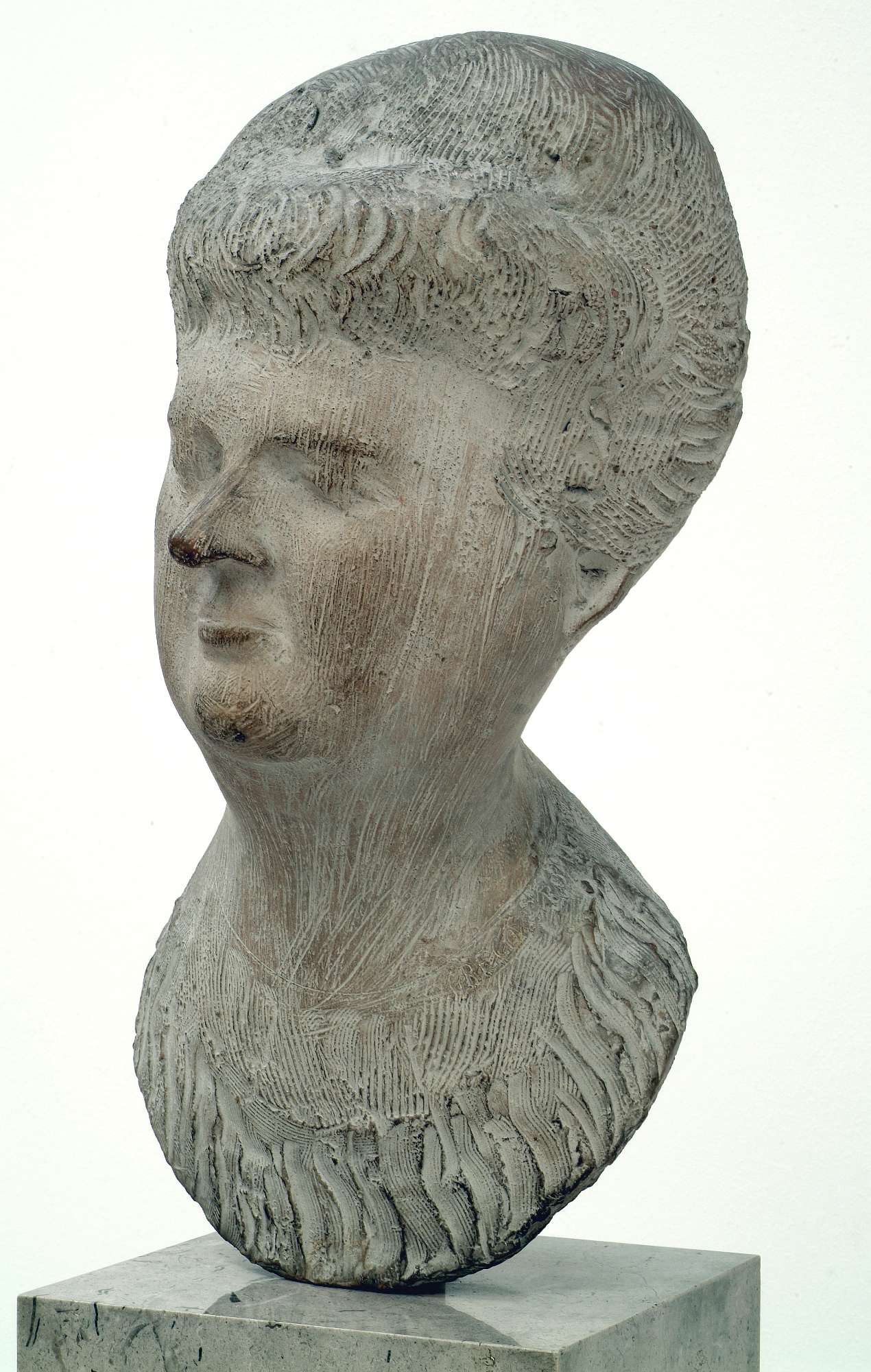 Conosciuta anche con il titolo di "Ritratto di anziana signora", l’opera in esame è stata acquistata dal Museo Revoltella alla Biennale di Venezia del 1952, dove figurava nella XXVIII sala accanto ad altri due lavori coevi in terracotta: Nudo ed Eroica. Nella figura femminile dai tratti maturi, Greco è riuscito ad infondere grazia e vitalità. Durante un’intervista lo scultore aveva affermato: «Ci sono due aspetti della bellezza, quella fisica, legata alla giovinezza, e quella morale, impalpabile, che non è possibile realizzare con una forma ma che, quando c’è, in qualche modo risalta dalle mani dell’artista». Modellando la terracotta – il cui uso nella scultura italiana moderna era stato introdotto da Arturo Martini – l’artista catanese dimostra una straordinaria sensibilità per i rapporti tra superficie, forma e luce; il leggero scatto del collo sembra propagarsi all’intera testa, grazie alle linee sintetiche del volto che lasciano scorrere la luce ed esaltare la pienezza dei volumi. Come in gran parte della produzione dell’artista, la superficie è incisa da graffi, che rimandano ai modelli etruschi, ma che diventano una precisa cifra stilistica dell’autore se si considera che generano «un sistema a fulcro di linee convergenti o divergenti verso superfici illuminate, sì che la massa, spesso una guancia, un seno, un naso, una superficie cioè eminente, pare nascere da queste zone-graffio che sono altrettante zone-ombra, centrali di vene e capillari irradianti sangue e volumi» (Carlucci). Emerge anche qui la complessa cultura plastica di Greco, che guarda tanto alla scultura antica – da quella della Magna Grecia, che assimila nella sua terra d’origine, a quella etrusca, romana e manierista – quanto ai moderni, in particolare Modigliani e Martini.