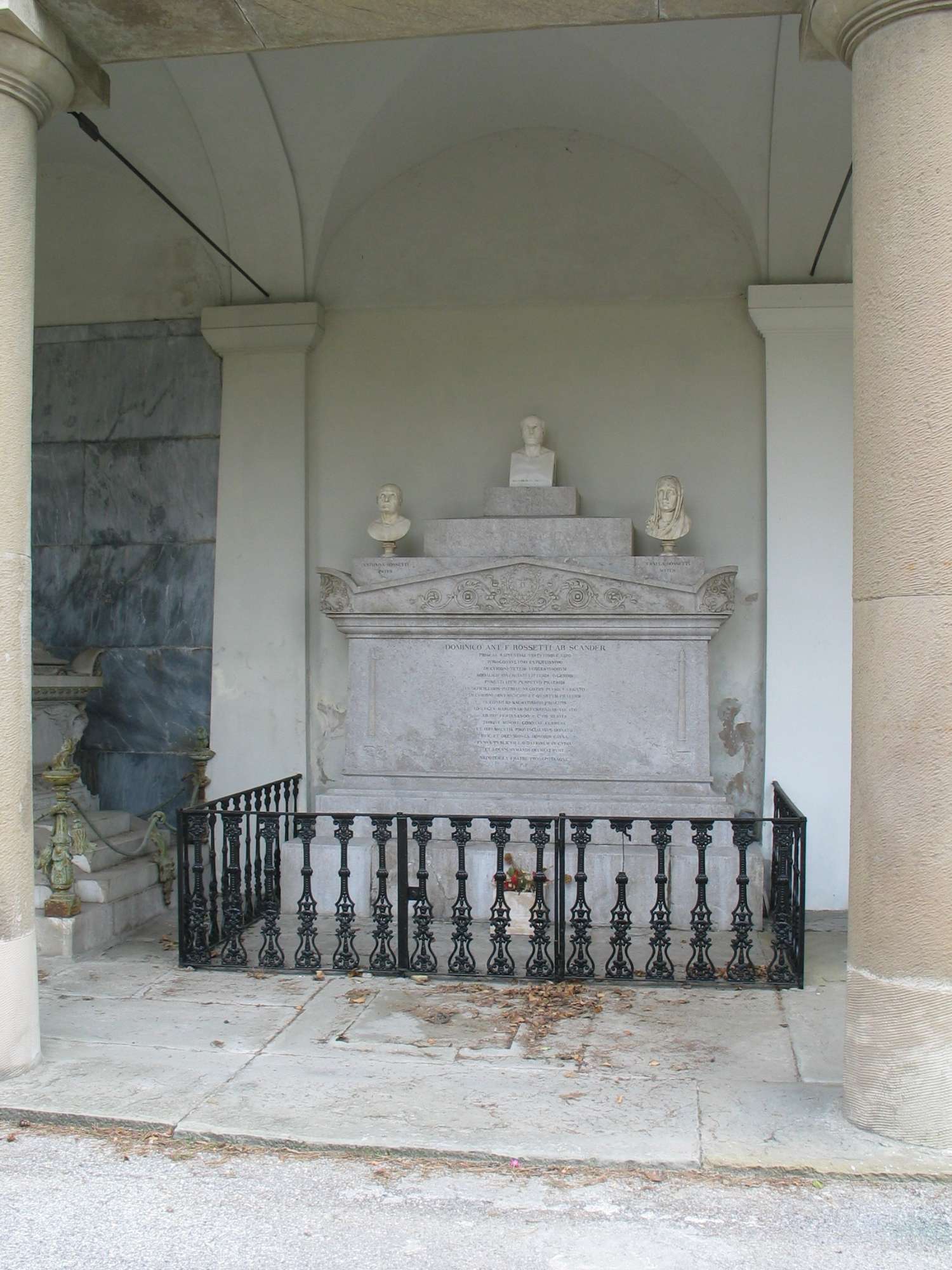 La tomba è stata concessa il 20.02.1843 a Antonio de Rossetti (Archivio Acegas APS). Durante i lavori di costruzione, il feretro di Domenico Rossetti venne ospitato nella tomba del costruttore Valentino Valle. Fu poi collocato nel terzo dei dodici loculi disposti nella parete di fondo della cripta sottostante. Per espressa volontà di Domenico Rossetti vennero qui tumulati i resti dei suoi genitori esumati dal cimitero di San Giusto. Dedicatari Antonio Rossetti de Scander; Domenico Rossetti. La famiglia Rossetti de Scander si stabilì a Trieste nel 1737. Antonio Pietro de Rossetti (Fiume, 1722-Trieste, 1814), deputato e direttore di Borsa, negoziante, armatore, fabbricante, possidente. Nobile del S.R.I., patrizio triestino (1776), conte ereditario (1779). Sposa Orsola Perinello, dalla quale ha dodici figli.