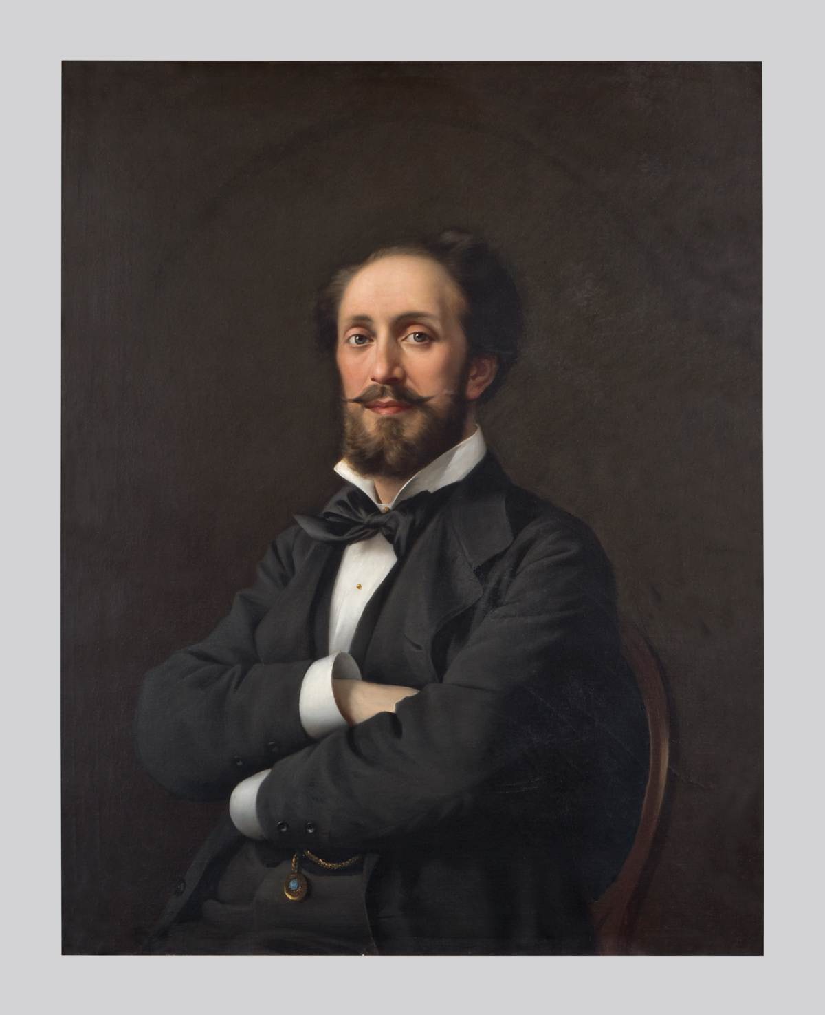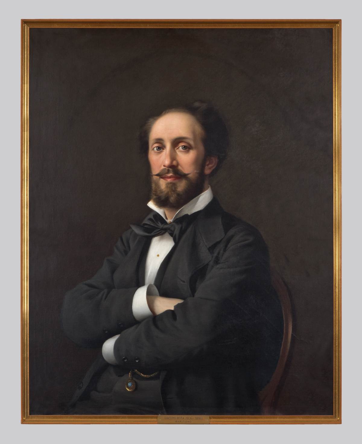 Ritratto a mezzobusto del baritono Giacomo Rota (Trieste 1836-1898) di fronte con il corpo leggermente ruotato a destra. Tiene le braccia conserte e indossa giacca e panciotto scuri, camicia bianca con collo alto e grande papillon di raso lucido al collo. Sotto il suo braccio sinistro una catena da orologio d'oro.