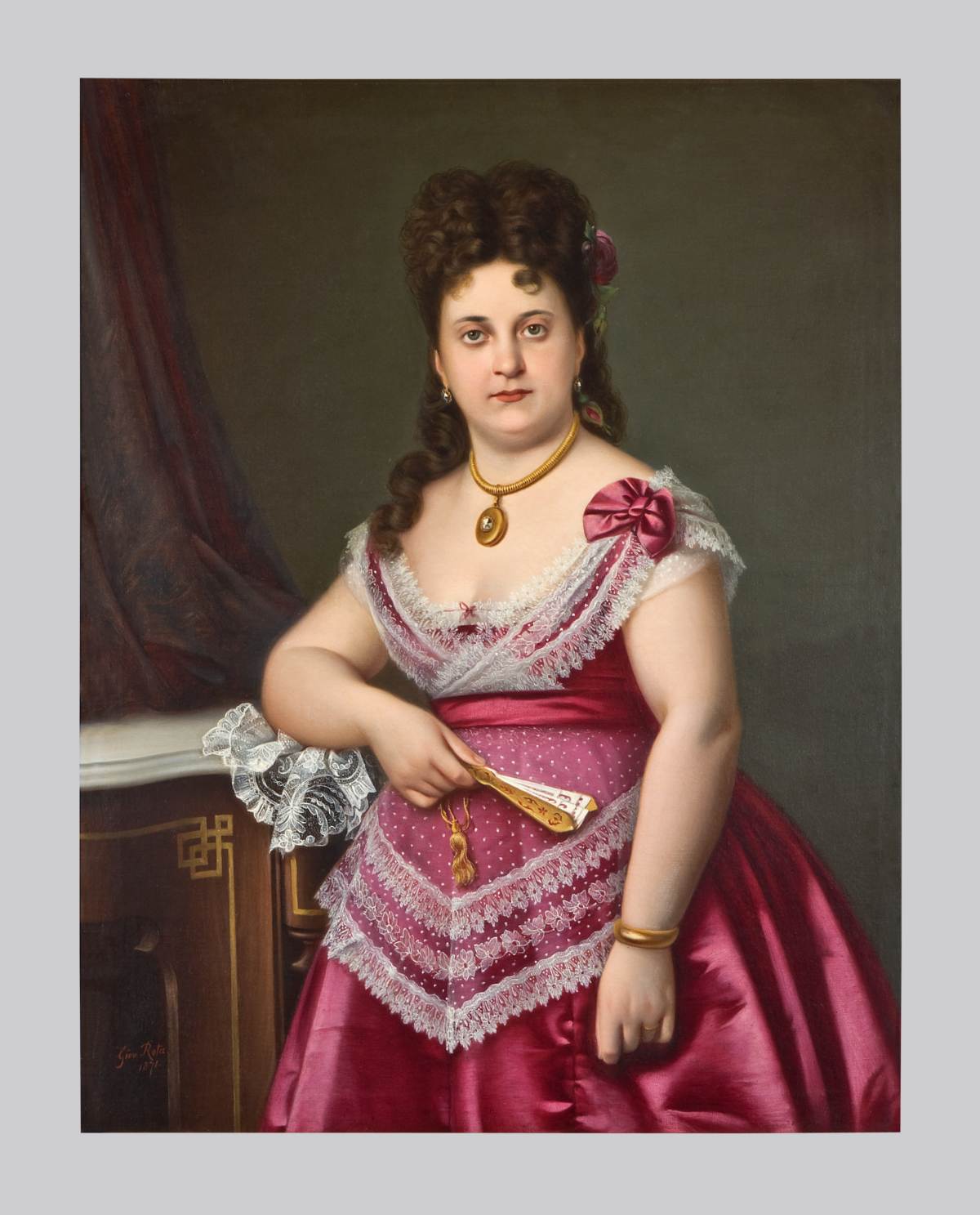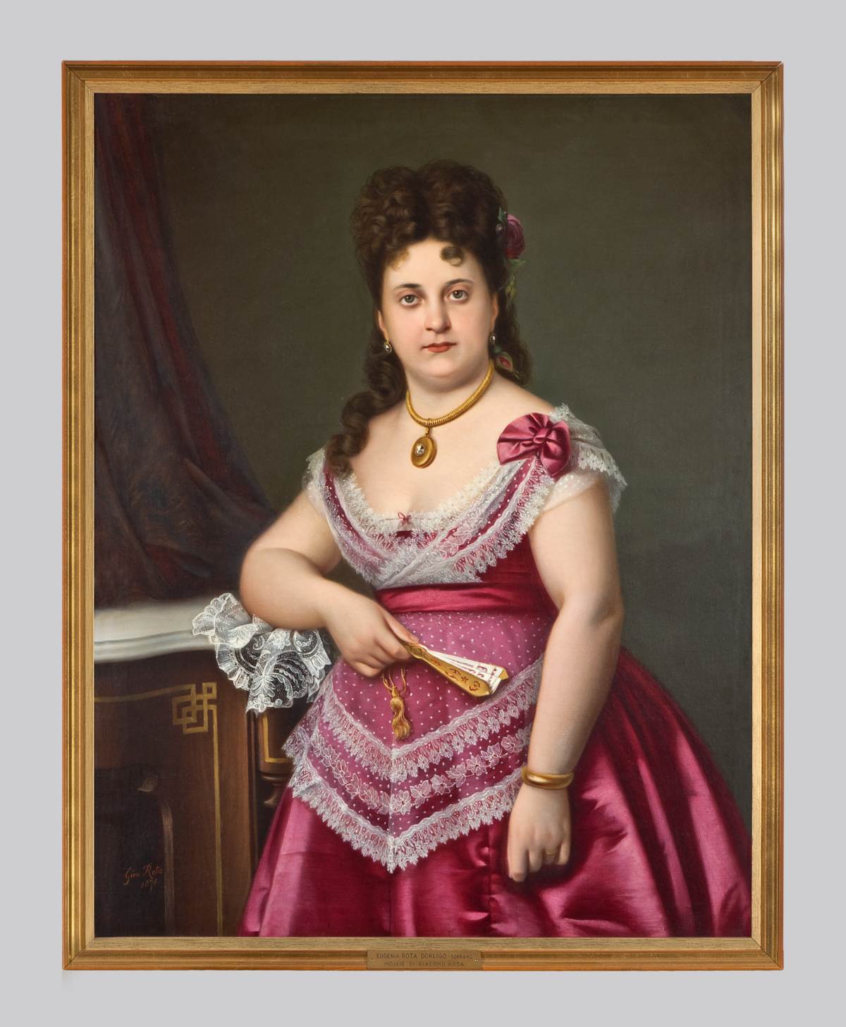 Ritratto di Eugnia Dorligo Rota. Si tratto di un dipinto a carattere ufficiale. L'effigiata è raffigurata in piedi, appoggiata ad un mobile ed indossa un raffinato abito in raso rosso impreziosito da un pizzo bianco. Il volto è caratterizzato da un'espressione seria e penetrante. La descrizione estremamente particolareggiata del lineamenti, del ventaglio, del tessuto dell'abito e dei gioielli (orecchini, collana con medaglione e brillante, bracciale ed anello) presuppone che l'artista si sia ispirato ad un'immagine fotografica