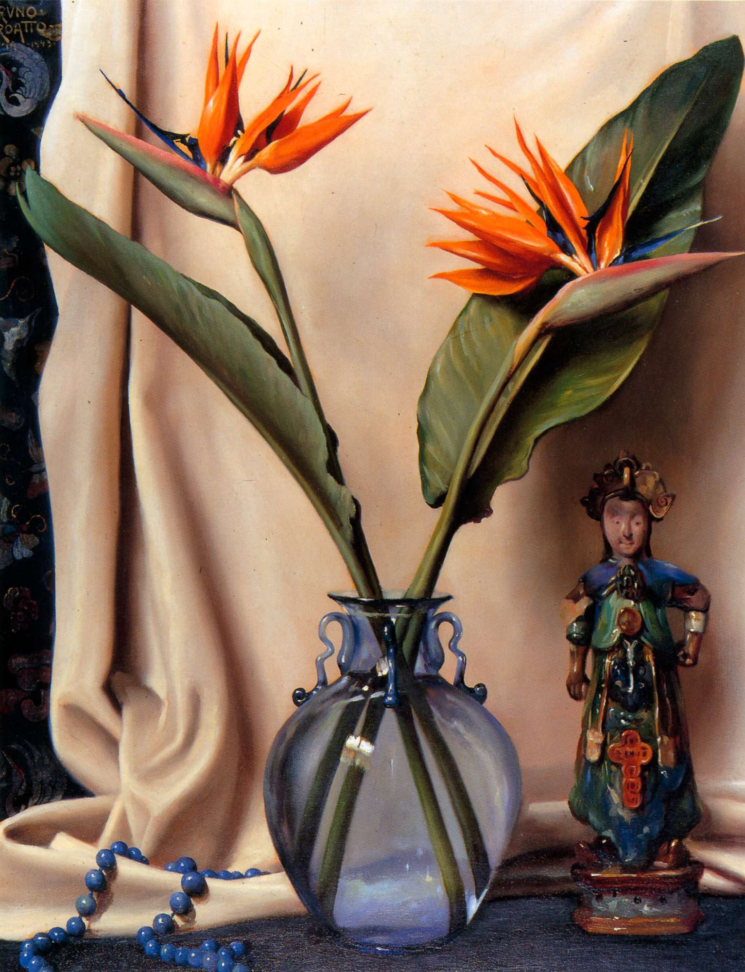 Schema compositivo ricorrente nelle nature morte dipinte da Bruno Croatto: al centro del quadro un vaso di vetro di foggia orientale di incredibile trasparenza contenente splendidi fiori - in questo caso due grandi strelitzie. Il motivo orientaleggiante è sottolineato dalla "statuina femminile con diadema sagomato a petali di loto, in biscuit e smalti policromi (Cina, epoca Quing, 1644-1911)" [Luisa Crusvar]