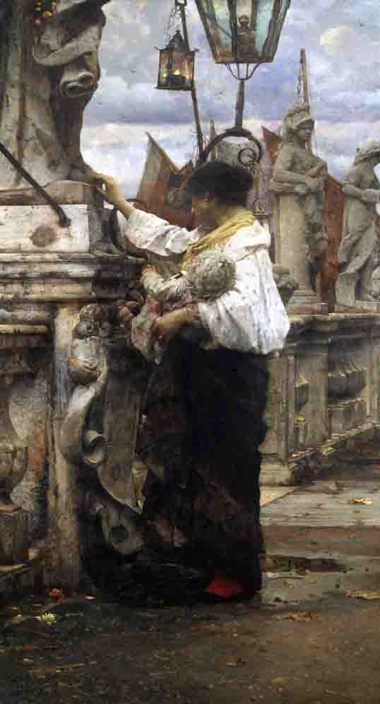 In quest'opera, amata più d'ogni altra perché per essa aveva posato la moglie col figlioletto in braccio (cfr. Nono, 1990, p.52), il pittore affronta uno dei “malinconici temi ddi desolazione, abbandono, preghiera, esequie nei quali la sua naturale propensione alla tristezza s'intorbida per un ostentato compiacimento sentimentalistico” (Monteverdi, 1975, II, p. 38). Si tratta di una variazione del soggetto scelto per fortunatissimo Refugium peccatorum, realizzato una decina d'anni prima (Galleria Nazionale d'Arte Moderna di Roma). In entrambe le opere una donna in atteggiamento umile e mesto è venuta a pregare presso il “Refugium peccatorum”, come recita l'iscrizione sotto la statua della Madonna, posta sopra la balaustra affacciata sul canale Perotolo che fiancheggia il duomo di Chioggia. In Ave Maria è intervenuto però un sensibile cambiamento nel taglio compositivo, una limitazione di campo che porta in primo piano lo stringente rapporto fra la Vergine marmorea e la madre carnale, che “nel suo risalto monumentale, ha la dignità di una Madonna del popolo” (Pavanello, 1983, p. 202). Del resto la critica ha spesso notato come l'indole pensosa di Nono conferisca “una nota particolare anche all'inquadratura, al taglio, alla impostazione del soggetto” (Perocco, La pittura veneta dell'Ottocento, Milano, Fabbri, 1967, p.20), “un'eccessiva inquadratura, che in certi casi si fa soffocante” (Somarè, Storia dei pittori italiani dell'Ottocento, Milano, L'Esame,1928, I, p.514). Può quindi non essere casuale il fatto che, nelle due versioni del tema in questione divenute più famose, l'artista abbia lasciato la Madonna quasi del tutto fuori campo, in qualche modo assente fra gli altri “assenti numi” sulla balaustra, cioè le laiche allegorie delle virtù (Fortezza e Prudenza), ormai malinconicamente decontestualizzate, che nel Settecento ornavano la scala maggiore del palazzo pretorio e accompagnavano l'ascesa della Madonna posta in cima a essa (cfr. Pregnolato, Su alcune sculture clodiensi dei secoli XVII e XVIII, Chioggia, a.III, n.4 giugno, 1990, pp. 19-38). Più ancora che la semplice ma commovente fede riposta dalla popolana nella divinità, Ave Maria rischia perciò di comunicare pessimisticamente il senso della sofferenza umana come condizione universale e ineluttabile, che è poi il tema vero di molti dipinti di Nono. Dal punto di vista tecnico-stilistico, il quadro fa giocare con raffinatezza poche note calde su una tessitura di tonalità prevalentemente fredde, lasciando squillare al centro i colori degli abiti della protagonista. L'iter conservativo ed espositivo della tela in esame è stato particolarmente accidentato: prima di essere inviata a Monaco, dove fu esposta nel 1892, essa stazionò per tre giorni in una sala della Permanente veneziana per consentire i ritocchi richiesti da un'ambientazione diversa da quella dell'atelier; ciò le impedì di figurare alla prima Biennale del 1895 perché fu applicato rigidamente il regolamento che ammetteva all'esposizione solo opere mai apparse in pubblico in Italia; tuttavia in quell'occasione essa fu comunque ospitata presso la Scuola di Pittura dell'Accademia di Belle Arti. Accolta nella mostra individuale dedicata a Nono dalla Biennale del 1901, benchè in seguito ripetutamente richiesta al Revoltella essa non partecipò più ad alcuna mostra fino al 1983, causa il delicato stato di conservazione. Quasi a confermare un destino infausto, anche l'importante retrospettiva del 1990 dovette rinunciarvi (per le vicende dell'opera cfr. Nono, 1990, pp.53-54, e le lettere scritte da Nono al Revoltella negli anni 1894 e 1895 conservate nell'Archivio del museo triestino). Per quanto concerne seconde versioni, variazioni sul tema, studi preparatori d'assieme o parziali per Ave Maria cfr: Mostra retrospettiva di Luigi Nono, 1934, cat. 742, 62, 72: mostra di Luigi Nono, 1964, cat. 76; Luigi Nono, 1990, cat.79. Per ulteriori informazioni su dipinti di analogo soggetto realizzati da Nono e da altri artisti si rinvia a Pavanello, 1983, p.202.