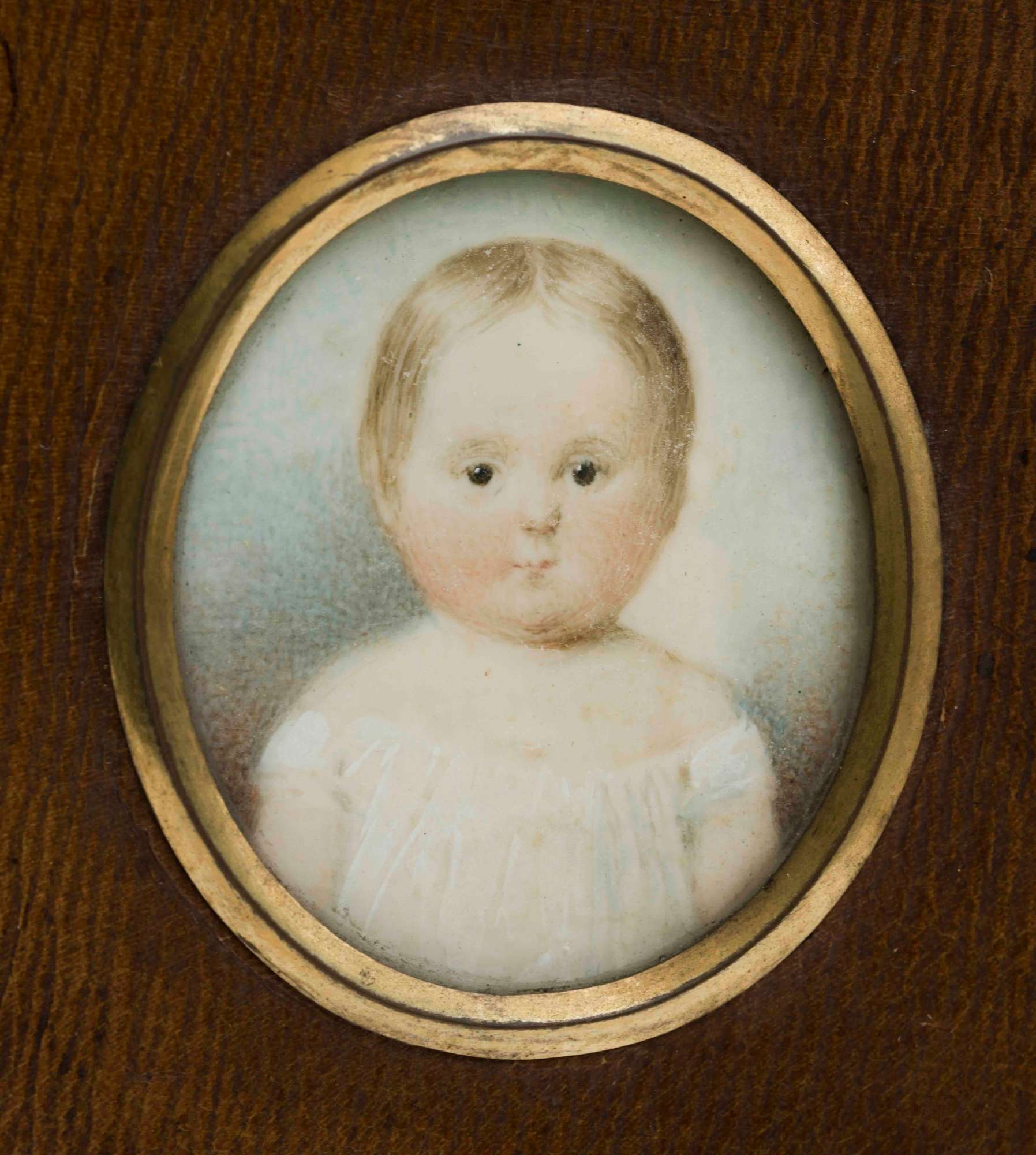 Miniatura di formato ovale appartenente a una serie di cinque che ritraggono la famiglia di Carlo Antonio Fontana (Trieste,1809-1886) e Adele Reisden (Trieste, 1814-1875). In particolare, l’opera secondo la tradizionale registrazione inventariale, ritrae Ortensia bambina (Trieste, 1846-1868), vestita di una leggera veste bianca. Se l’identificazione dell’effigiata fosse corretta, la miniatura dovrebbe esser stata eseguita dopo il 1846, e inclusa nella cornice solo in momento successivo. Tuttavia non si esclude possa essere Adelaide, nata nel 1839.