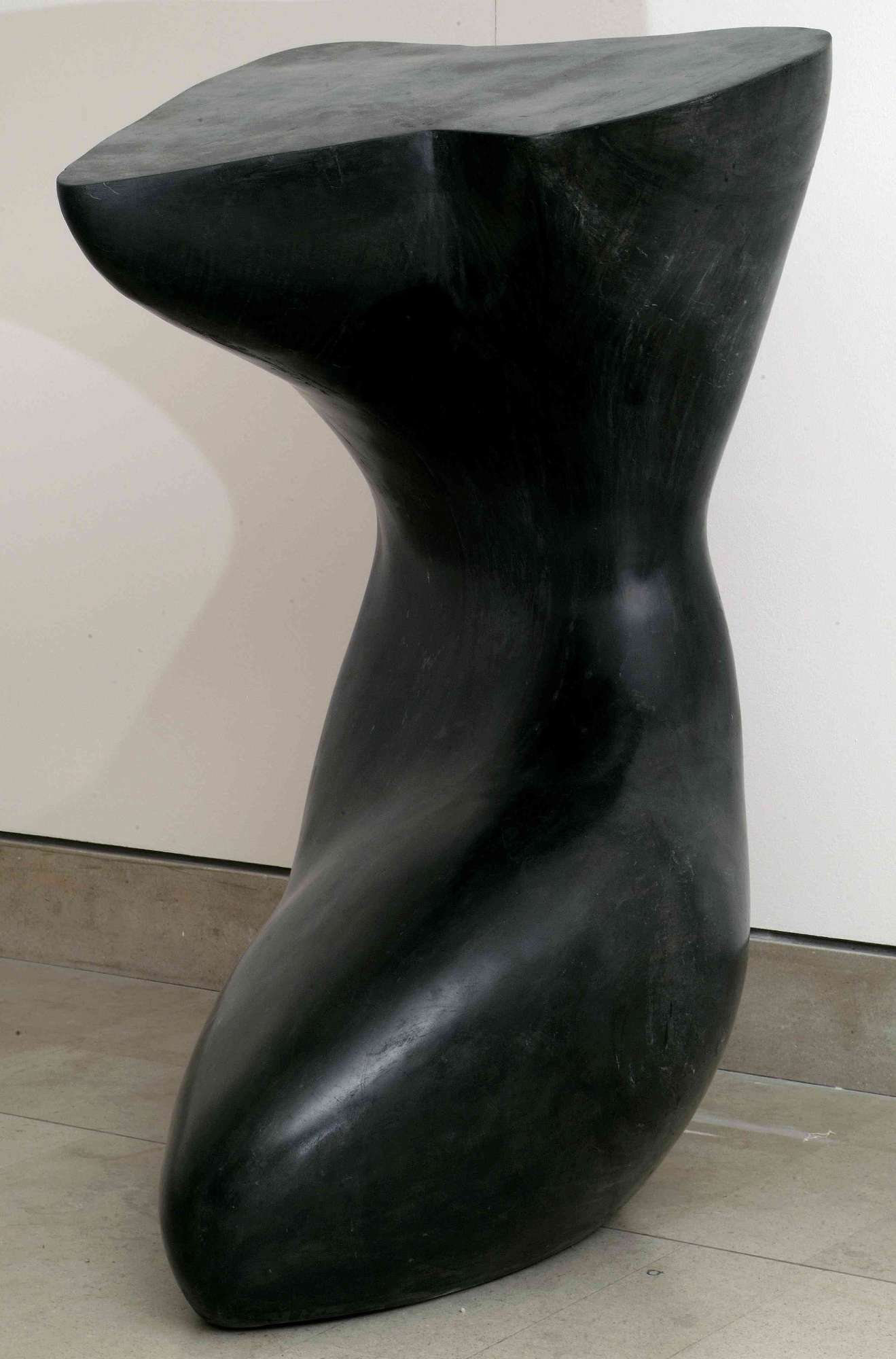 Capolavoro tra i più noti di Viani, Cariatide è stata tradotta in materiali diversi: si conoscono due copie in gesso, una alla GNAM di Roma (datata 1951) e l’altra nella raccolta Viani di Mestre, una in marmo bianco della Galleria d’Arte Moderna Ca’ Pesaro di Venezia e una in bronzo della collezione Fischl di Milano. L’originale in gesso compare con il titolo di Nudo alla Biennale di Venezia del 1952 – dove l’artista ottiene il Premio del Comune di Venezia – e viene riproposta con il titolo di Cariatide anche nell’edizione del 1958 della stessa rassegna, alla mostra antologica sull’artista allestita dall’architetto Carlo Scarpa e presentata in catalogo da Giuseppe Mazzariol. In quest’ultima occasione viene acquistata dal Museo Revoltella per la somma di 800.000 Lire. L’autore, in una lettera a Mascherini del settembre 1958, esprime il desiderio di essere presente nella collezione triestina con «un’opera in materiale definitivo»; per questo motivo il gesso viene inviato ad un laboratorio di marmi di Carrara per essere riprodotto in marmo nero. Al momento della consegna al museo del marmo e del gesso, vengono chiesti all’artista suggerimenti in merito alla forma e al colore più idonei per le basi, ma egli risponde «non sono mai riuscito a indovinare un basamento per le mie cose perché io le penso sospese come idee platoniche» (CMR, Arch. Amm., 14.1961.4807). Concorda con lui Giuseppe Marchiori, che ha rilevato come i suoi corpi sinuosi «si trasformano in ritmo di forme aeree, non più vincolate alla terra, librate in uno spazio che significa ascesa, come simboli arcani di astratta purezza». Giuseppe Mazzariol, invece, nel catalogo della Biennale di Venezia del 1958, ne esalta la tensione vitale e la pienezza terrena delle masse plastiche, che toccano «accenti di un’accorata sensualità». I richiami al classicismo sono stati riconosciuti da molti critici – come Ragghianti, De Micheli e Argan – e il fatto che il titolo di Nudo sia stato poi sostituito con quello di Cariatide, sembra confermare queste intenzioni nell’autore. Seppur vi sia una veduta preferenziale dell’opera, che permette di apprezzarne la purezza formale, il pregio della scultura sta soprattutto nell’equilibrio di assottigliamenti e dilatazioni, che danno alle masse e ai profili una fluidità continua e musicale.