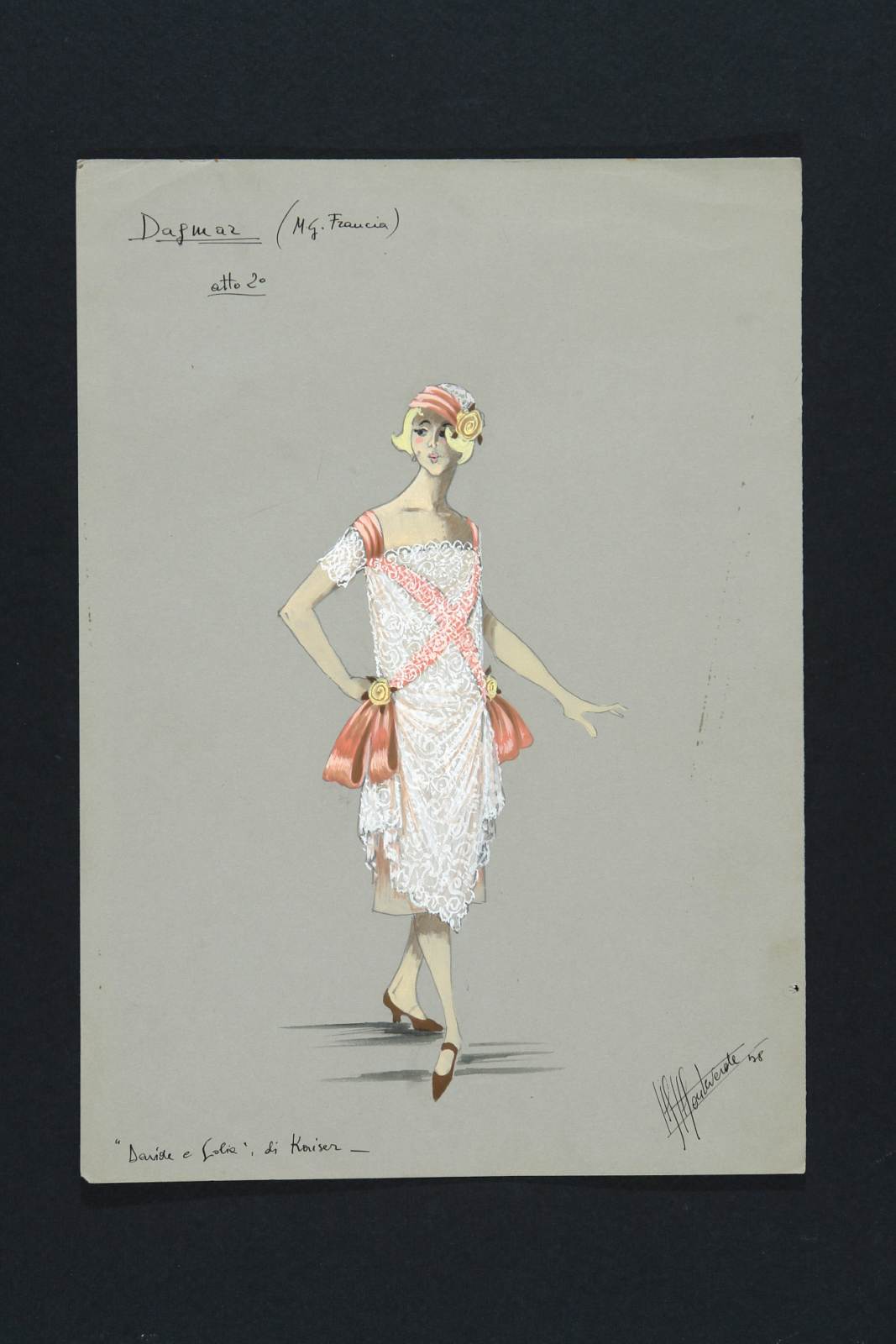 Davide e Golia, opera di Georg Kaiser. Disegno per figurino per il personaggio di Dagmar. Figura femminile, volto ruotato a destra, corso a sinistra. Abito a tubino beige con sopravveste in pizzo bianco trattenuta ai fianchi. Spalline in seta rosa, fasce rosa in seta intrecciate dalle spalle ai fianchi con rose gialle applicate sui fiocchi. In testa zucchetto in pizzo bianco con fasce in tessuto rosa e fiore in stoffa gialla. Scarpe décolleté a punta con cinturino alla caviglia