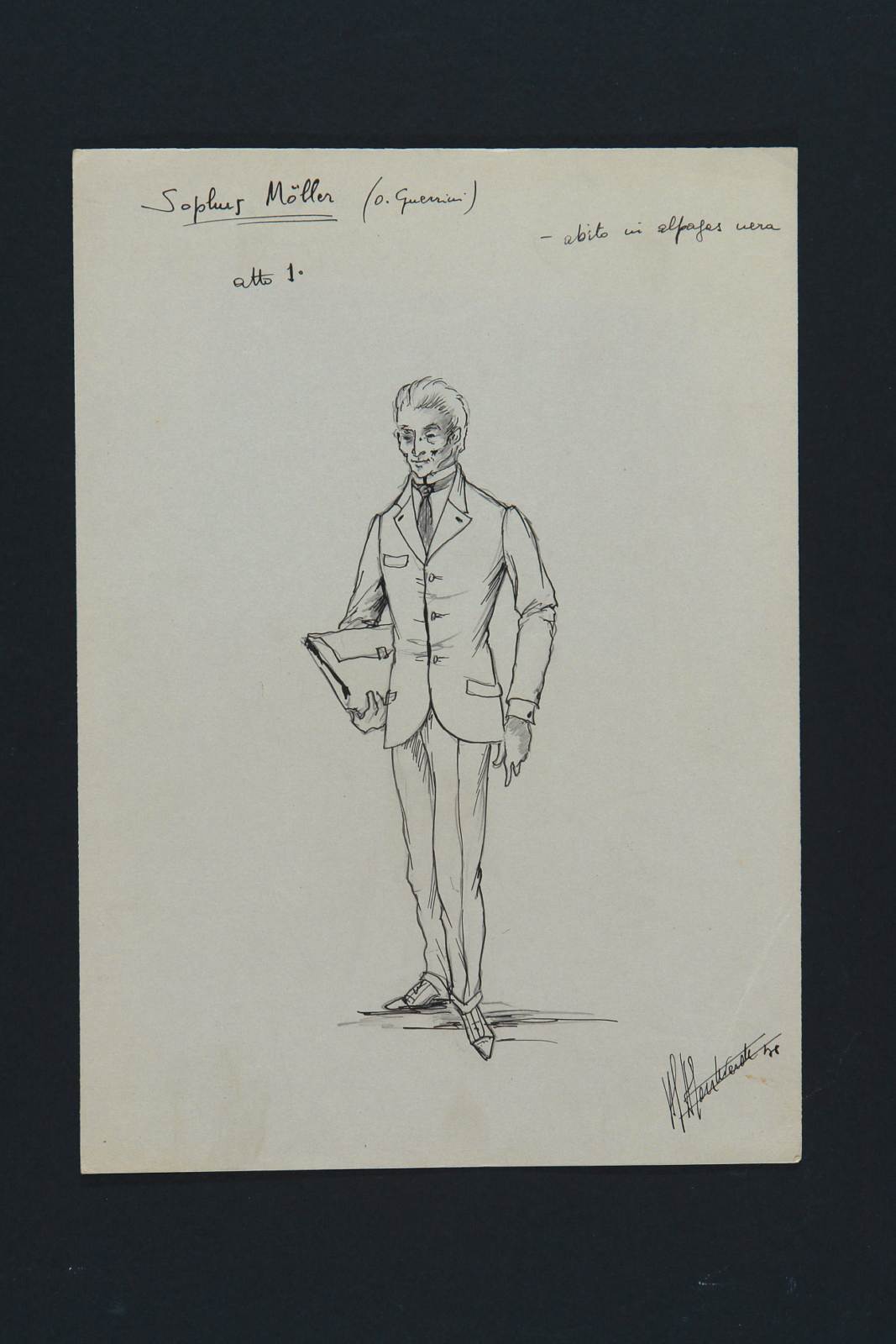 Davide e Golia, opera di Georg Kaiser. Disegno per figurino per il personaggio di Sophus Möller. Figura maschile leggermente ruotata a destra, indossa camicia a collo alto con cravatta, giacca, pantalone lungo, scarpe a punta. Sotto il braccio destro tiene una cartella