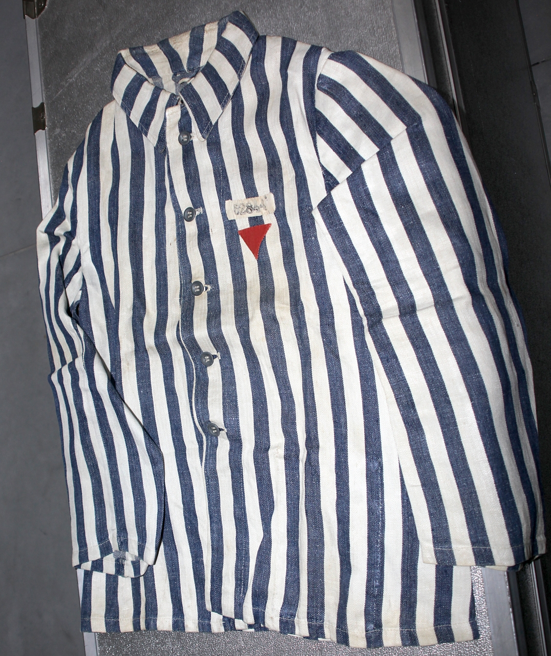Si tratta di una giacca da deportato in stoffa a righe bianche e blu, con cinque bottoni sul davanti. Appuntato a sinistra c'è il triangolo rosso rovesciato e sopra a esso il numero 62844.