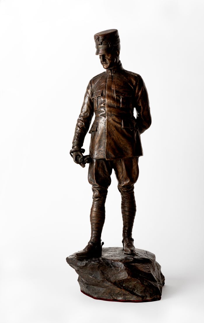 L’opera è entrata a far parte della collezione nel 1933 e poche sono le notizie a essa relative. Emanuele Filiberto di Savoia, comandante della Terza Armata, viene ritratto dallo scultore in una posa poco spontanea, probabilmente in vetta a un dirupo, con una mano dietro la schiena e con l’altra impegnato a reggere un cannocchiale. L’uniforme militare è descritta nei dettagli secondo uno stile verista mentre l’elmetto, calato sulla fronte, non nasconde uno sguardo dritto e sicuro. L’opera, di cui esistono più versioni fu eseguita probabilmente durante la prima guerra mondiale quando, nonostante i suoi sessant’anni, allo scultore fu consentito di partire come volontario per il fronte. Nonostante le difficoltà, Ximenes continuò a lavorare «nell’ampio studio di Cervignano, almeno fino a quando questo non fu smantellato dai nemici e anche dai nostri, e dove, quando più urgenti doveri glielo concedevano, egli lavorava con tranquillo entusiasmo, come fosse invece nel proprio studio di Piazza Galeno» (Fleres). A questi anni risale la conoscenza diretta del discendente della famiglia Savoia da parte dello scultore premiato dal duca con la medaglia d’argento per valide e onorevoli motivazioni: «Ximenes Ettore di Palermo, tenente di complemento, reggimento genio. Durante un violento bombardamento di grossi calibri dell’artiglieria avversaria, si recava di sua spontanea volontà al cantiere di lavoro, soggetto al tiro, e nonostante fosse stato gettato a terra dalla violenza di un colpo scoppiato a pochi passi da lui, con calma e coraggio esemplari provvedeva a far mettere al riparo gli operai sorpresi dal bombardamento, dimostrando sprezzo del pericolo ed elevatissimo sentimento del dovere. Sdraussina, 25-4-1917» (Fleres 1928). Il bronzo in questione è una delle varie opere celebrative che l’artista realizza in questi anni, come dimostrano anche i ritratti del re Vittorio, di Armando Diaz duca della Vittoria e i piccoli busti d’argento del duca e della duchessa d’Aosta, oltre a una serie di statuette raffiguranti ufficiali francesi e inglesi.