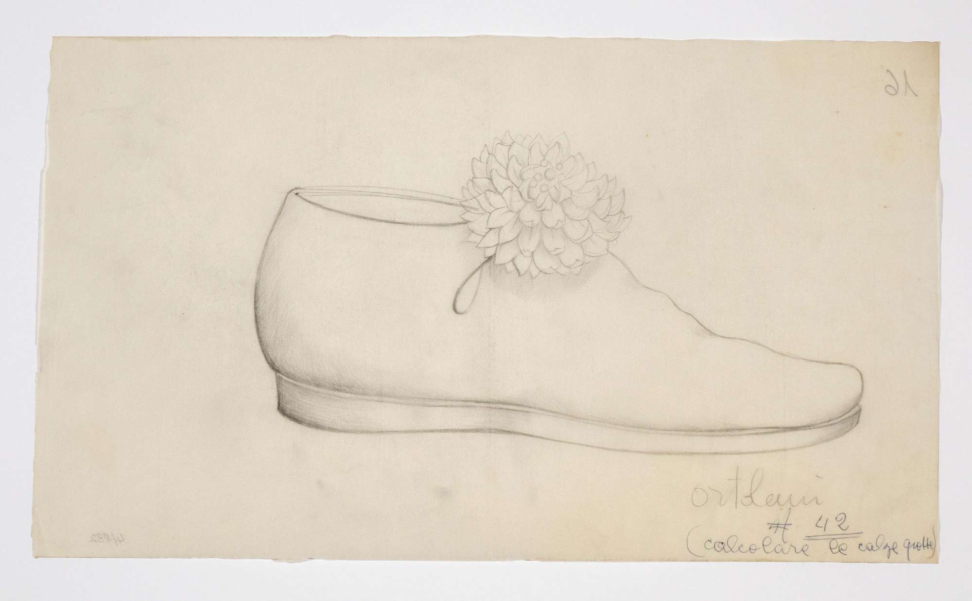 Il gioco dei potenti, libero adattamento di Giorgio Strehler da Enrico VI, dramma storico di William Shakespeare, in 15 atti e 2 giornate. Calzatura bassa con pon-pon a fiore, di profilo verso destra.