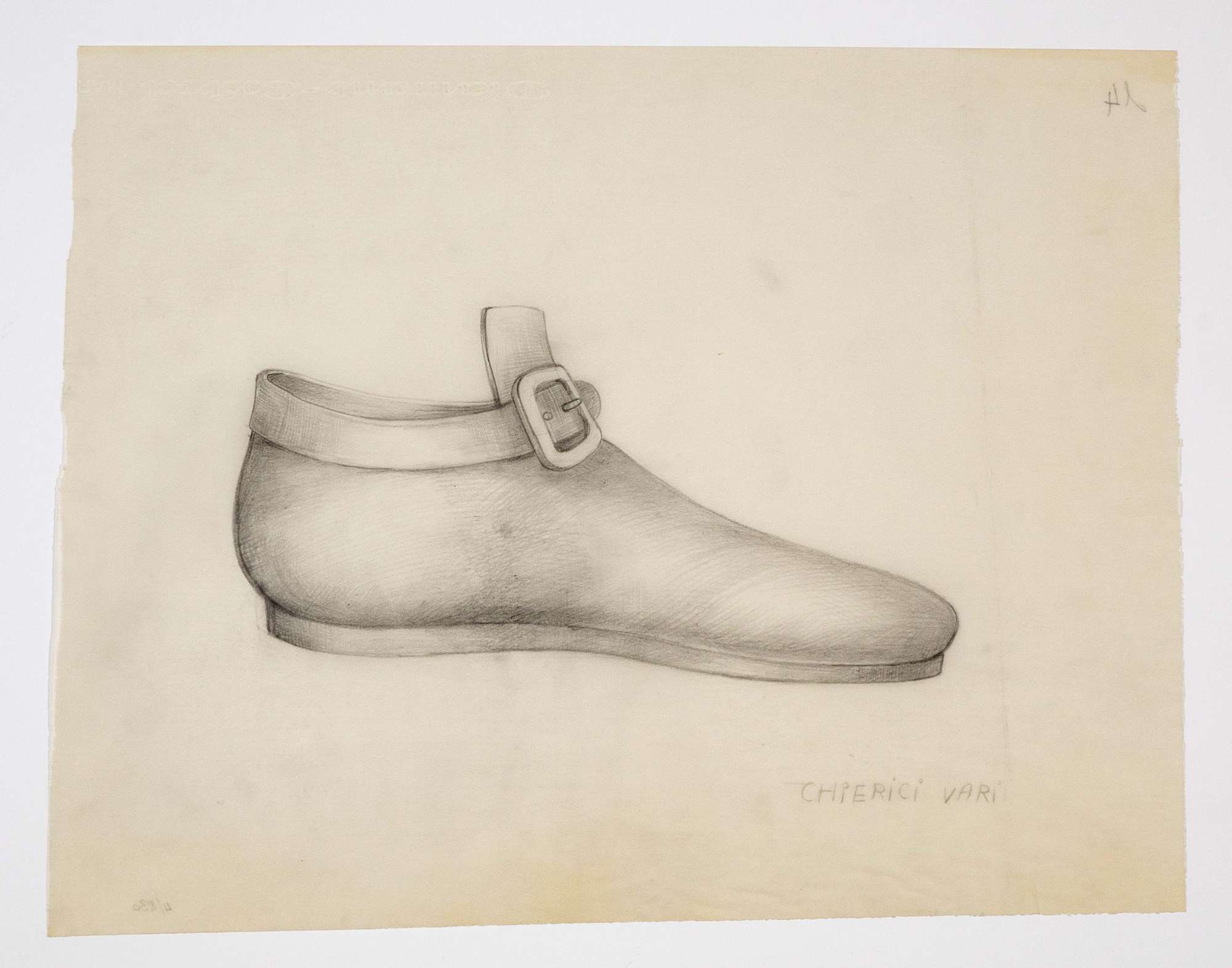 Il gioco dei potenti, libero adattamento di Giorgio Strehler da Enrico VI, dramma storico di William Shakespeare, in 15 atti e 2 giornate. Calzatura bassa con fibbia e linguetta alta, di profilo verso destra.