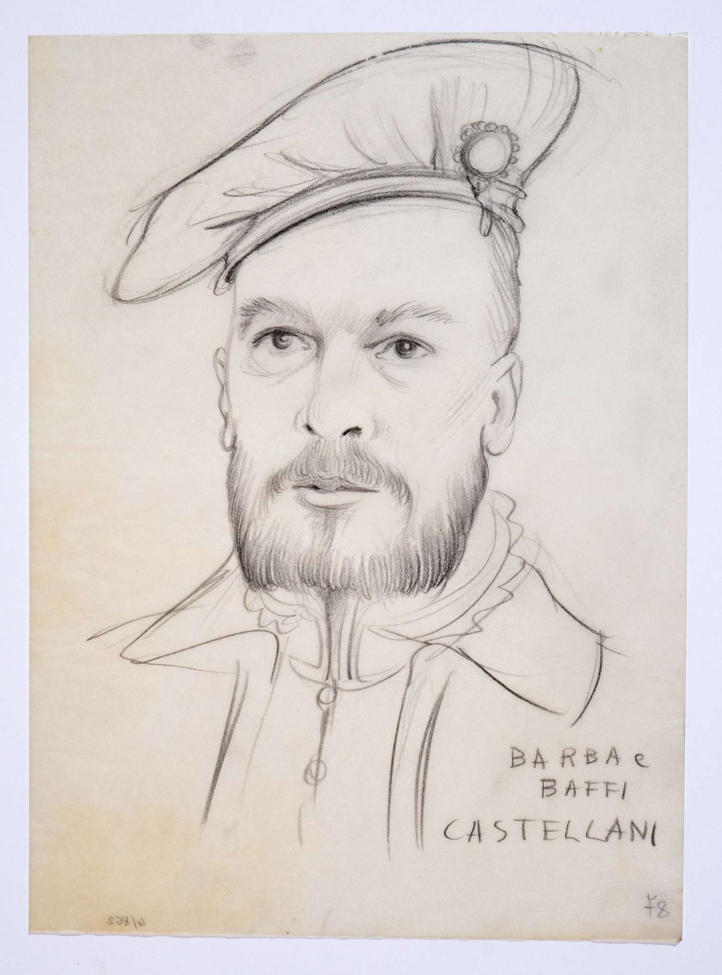Il gioco dei potenti, libero adattamento di Giorgio Strehler da Enrico VI, dramma storico di William Shakespeare, in 15 atti e 2 giornate. Ritratto di testa maschile leggermente di tre quarti, con copricapo piatto con fermaglio, barba squadrata e baffi, colletto montante con pizzo.