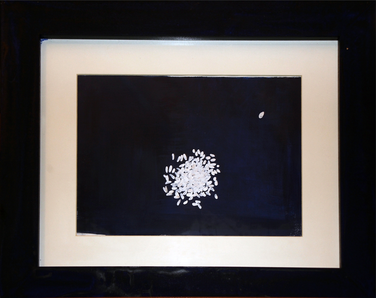 Lo sfondo è tutto di un blu intenso, al centro un mucchietto di riso da cui stacca un chicco, che è isolato, in alto a destra.