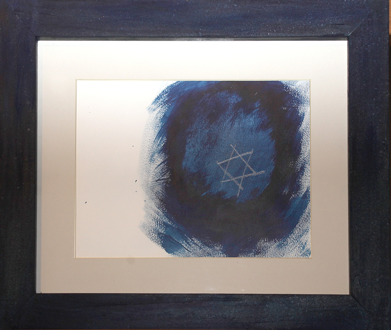 Il foglio è diviso a metà: a sinistra bianco, a destra una stella di David è disegnata su uno sfondo blu.