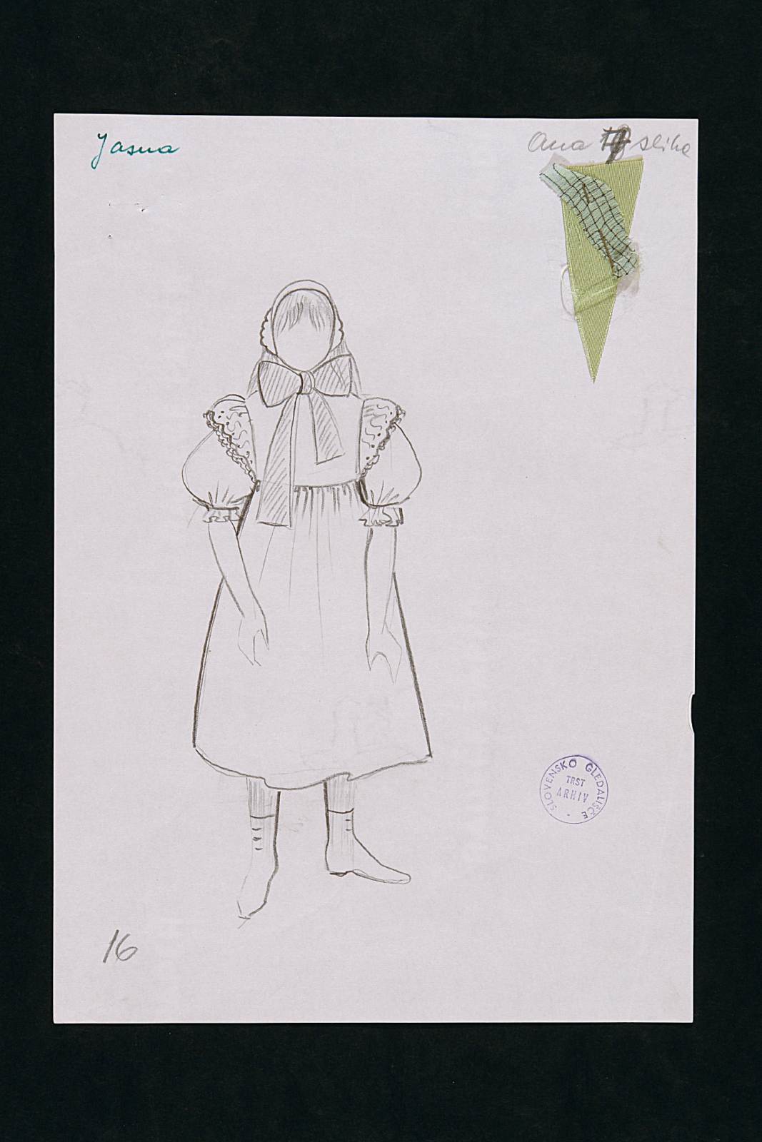 La coscienza di Zeno (Zenova Izpoved), di Italo Svevo nel rifacimento scenico di Tullio Kezich. Costume per Ana. Figura di bambina intera, abito a mezza lunghezza, camicia con collo a corolla, fascia in vita, fiocco nei capelli