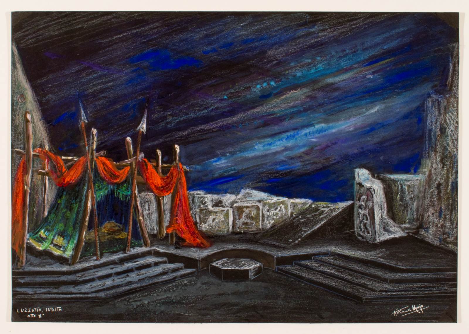 Judith, dramma biblico di Livio Luzzatto, atto 2. Accampamento assiro. Terrapieno con pedana a scivolo e due scale laterali. Tenda supportata da traliccio ligneo, due lance e drappo rosso