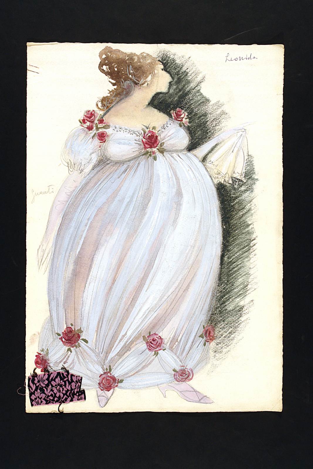 La cagnotte, testo teatrale di Eugène Labiche. Figurino per Léonida, figura femminile intera, di profilo verso destra. Indossa un abito bianco con ampia scollatura e cosparso di rose sul fondo. sul giromanica e alla scollatura. Fazzoletto bianco in mano