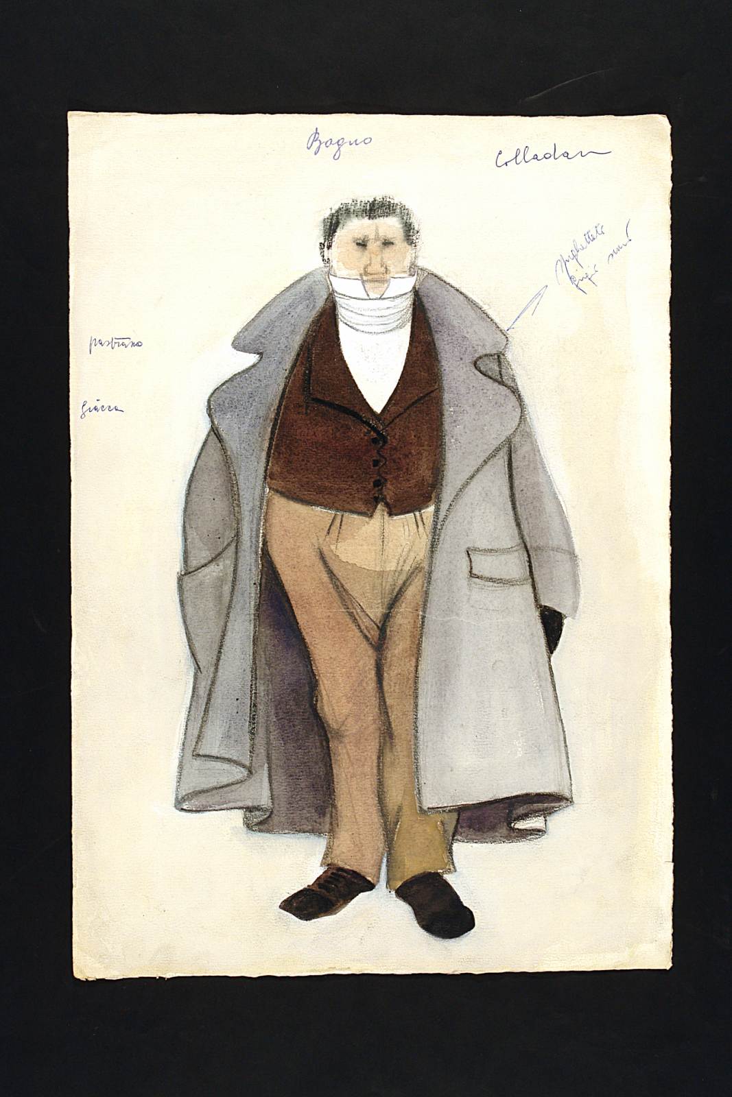 La cagnotte, testo teatrale di Eugène Labiche. Figurino per Colladan. Figura maschile intera di fronte, indossa redingote grigio chiaro aperta sul davanti, lascia vedere giacca marrone e calzoni beige, camicia bianca a collo alto chiusa da foulard
