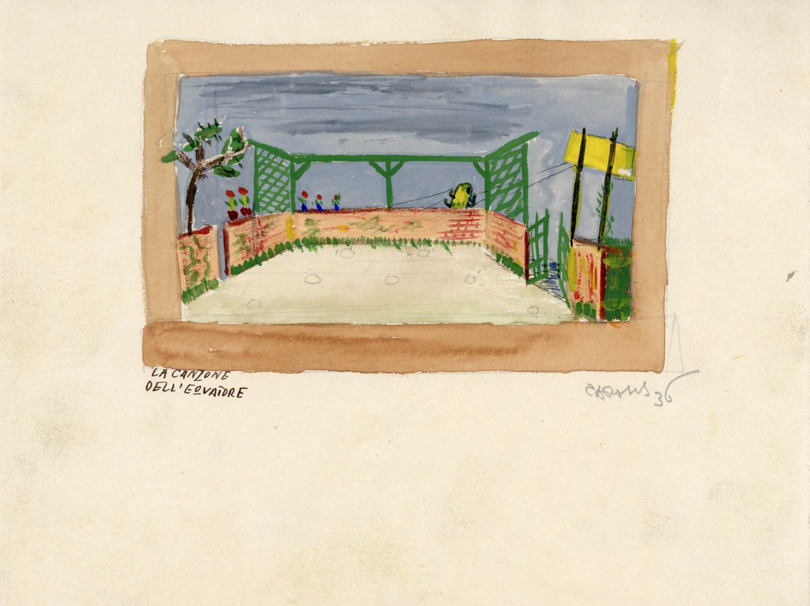 Bozzetto scenografico per L'osteria degli immortali, tre atti brevi di Mario Massa, rappresentata il 28 maggio 1936 nella Sala Massima di Via Coroneo 15 per il Teatro del Dopolavoro di Trieste. Scenari eseguiti dallo scenografo G. Rossi su bozzetti di Cergoly. Nella stessa serata era rappresentata anche La canzone dell'equatore, un quadro di Cesare Batti oggetto dello stesso dono insieme anche a due bozzetti di Giacomo Rossi relativi a L'osteria degli immortali (CMTOA04_000512; CMTOA04_000513)