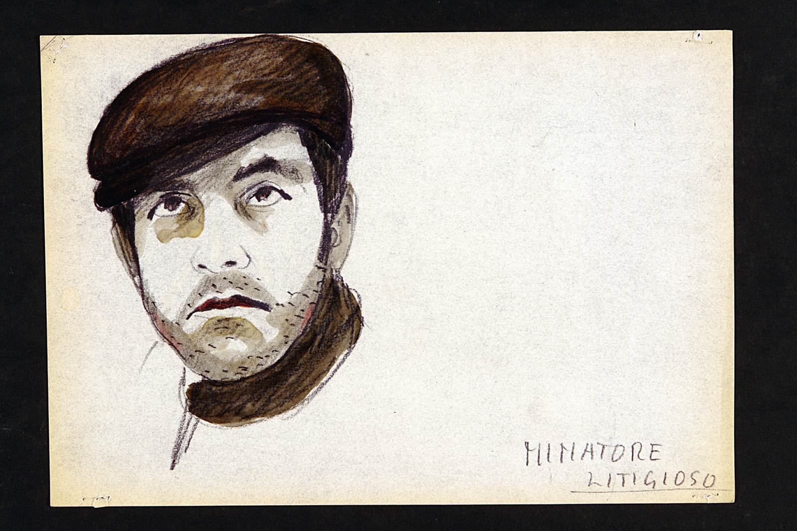 La danza del sergente Musgrave, testo teatrale di John Arden. Personaggio minatore litigioso, volto maschile con cappello e dolcevita