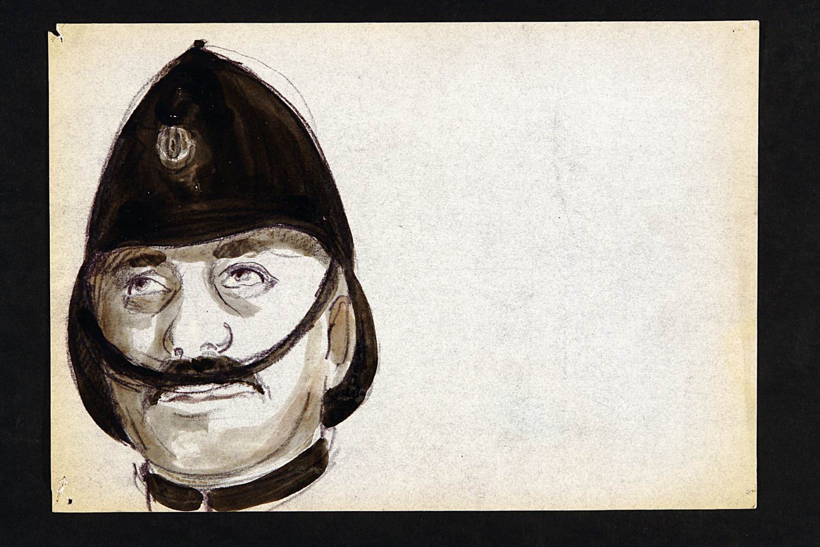 La danza del sergente Musgrave, testo teatrale di John Arden. Personaggio guardia con cappello tipico delle guardie inglesi e colletto nero